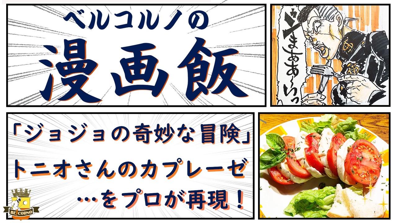 <span style="color: #000000; font-size: 14px;">シェフが漫画・アニメ・映画に出てくる料理やスイーツを再現する「ベルコルノの漫画飯」。<br><br>【漫画飯】リスト:</span><span style="color: #006699; font-size: 14px;"><a href="https://www.nicovideo.jp/my/mylist/#/66008633" target="_blank" rel="noopener nofollow">https://www.nicovideo.jp/my/mylist/#/66008633</a></span><br><br><span style="color: rgba(0, 0, 0, 0.8); font-size: 16px;"> 今回は、「ジョジョの奇妙な冒険」第4部(ダイヤモンドは砕けない)に出てくる、杜王町「トラサルディー」のシェフ・トニオさんのコース料理の前菜「モッツァレラチーズとトマトのサラダ」を再現します。<br><br> 原作では億泰が食して肩こりが治るわけですが、さすがにそこまでは再現できません。スタンド「パール・ジャム」があればなぁと思うことしきりです。<br><br> 「トマトとモッツァレラのサラダ」は、「カプレーゼ」の名前で一般的によく知られています。正式には「Insalata Caprese(インサラータ・カプレーゼ:カプリ風サラダ)」といい、南イタリア・ナポリ湾に浮かぶカプリ島から命名されています。ナポリ出身のトニオさんにとっては特に親しみの深い料理と言えます。基本的にはトマトとモッツァレをスライスし、塩・胡椒オリーブオイル、バジルで調味するだけのシンプルな料理です(それだけに素材の味が重要です)が、このトニオさんレシピでは、トニオ・オリジナルドレッシングが味のポイントになっています。いわゆるイタリアンドレッシングですが、ここにワカメが入っているのがポイントです。<br><br> 「イタリア料理にワカメ?」と思う方もおられるかもしれませんが、南イタリアはヨーロッパでは珍しく海藻を食べます。また、レストラン「トラサルディー」のある杜王町のモデルとなっている宮城県(仙台市)もまた、三陸沖の豊かな海が育む海藻が名物となっており、これを使うことで、トニオさんは杜王町という土地への愛情やリスペクトを、この料理に込めたのではないかなと僕は思いました。<br><br> 作業自体は難しいことがない料理ですので、是非作って頂きたい一皿です。モッツァレラは水牛の方が味にコクがありますが、乳牛のモッツァレラを使用してももちろん美味しく召し上がって頂けます!<br> <br> トマトは、是非糖度の高いフルーツトマトを使ってみましょう。</span>