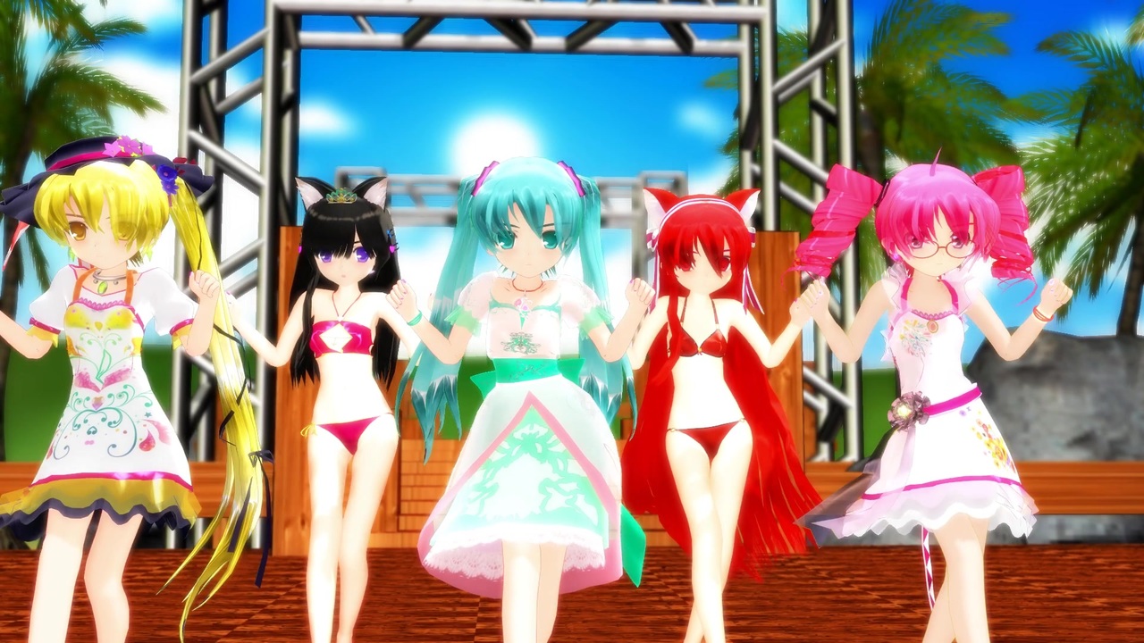 おじ様(おっさん?)たちがうるさいので8月限定で公開します~<br><br>ちびキクが着ているのが5年くらい前に作った普通のビキニタイプ。<br>みみ子が着ているのが去年デザインしたもので、どちらもトップスだけの作成。<br>アンダーはおたもんさんのらぶ式ちびミクのPのアレンジ。<br>まぁ、モデルがコケシ体形なのでお色気も何もありませんがぁ~<br><br>どちらも、肩周りのウエイトが残念なので普段はモーションで修正してるのですが、こう暑くてはそういう元気が・・・なので、肩周りの破綻はお見逃しを><(そのうちにちゃんと修正版上げます;;<br><br>お借りした物<br><br>曲:【IA×巡音ルカ】アッパーチューン【オリジナル】<a href="https://www.nicovideo.jp/watch/sm21022894" class="watch">sm21022894</a>(ヤキソバ 様)<br>モデルモーション:【第15回MMD杯EX】アッパーチューン 【モーション配布】<a href="https://www.nicovideo.jp/watch/sm26951687" class="watch">sm26951687</a>(久尊 様)<br>カメラモーション:【トゥーンなオイゲンで】アッパーチューン【MMD艦これ】カメラ配布 <a href="https://www.nicovideo.jp/watch/sm29401667" class="watch">sm29401667</a>(納豆チーズ 様)<br><br>モデル:ベースモデル(らぶ式ミク(作者様不明)+らぶ式ちびミク <a href="https://www.nicovideo.jp/watch/sm14590447" class="watch">sm14590447</a>(おたもん様)から作成)<br>らぶ式ちびミク :ベースモデル + 自作衣装<br>らぶ式ちびネル :ベースモデル + 自作衣装<br>らぶ式ちびテト :ベースモデル +らぶ式改変HVテトv2(だそ様)+ 自作衣装<br>らぶ式ちびキク :ベースモデル + 自作衣装<br>らぶ式ちびみみ子:ベースモデル + 12M <a href="https://www.nicovideo.jp/watch/sm15694284" class="watch">sm15694284</a>(とらはぜ様)+ 自作衣装<br><br>アクセサリー<br>キラキラしたティアラ配布 <a href="https://seiga.nicovideo.jp/seiga/im4137087" target="_blank" rel="noopener">im4137087</a>(ねこる@宝飾P様)<br>】Ventricle2種 <a href="https://seiga.nicovideo.jp/seiga/im4216047" target="_blank" rel="noopener">im4216047</a>(虎姐様)<br><br>ステージ<br>ヤシの木ステージ <a href="https://seiga.nicovideo.jp/seiga/im6966868" target="_blank" rel="noopener">im6966868</a>(STONE 様)<br>Beehive島 <a href="https://seiga.nicovideo.jp/seiga/im6966580" target="_blank" rel="noopener">im6966580</a>(山田淀子 様)<br><br>エフェクト<br>ExcellentShadow2 / XDOF2(そぼろ 様)<br>o_SelfOverlay_v0_5 (おたもん 様)<br>AdultShader v0.14(Elle/データP様)<br><br>モデルエディター<br>PMXediter v0.2.5.1 x64(極北P 様) メタセコイア ver3.1.6(O.Mizno 様)<br><br>編集/エンコード<br>AviUtl 0.99m(KENクン様) つんでれんこ v2.97(窓屋様)<br><br>最後に、参考にさせていただいた 音源 MMD動画モデル モーション& 全てのツールの作者様に感謝を<br>いつも、ありがとうございます<br><br>広告御礼:<a href="https://seiga.nicovideo.jp/seiga/im9516876" target="_blank" rel="noopener">im9516876</a>