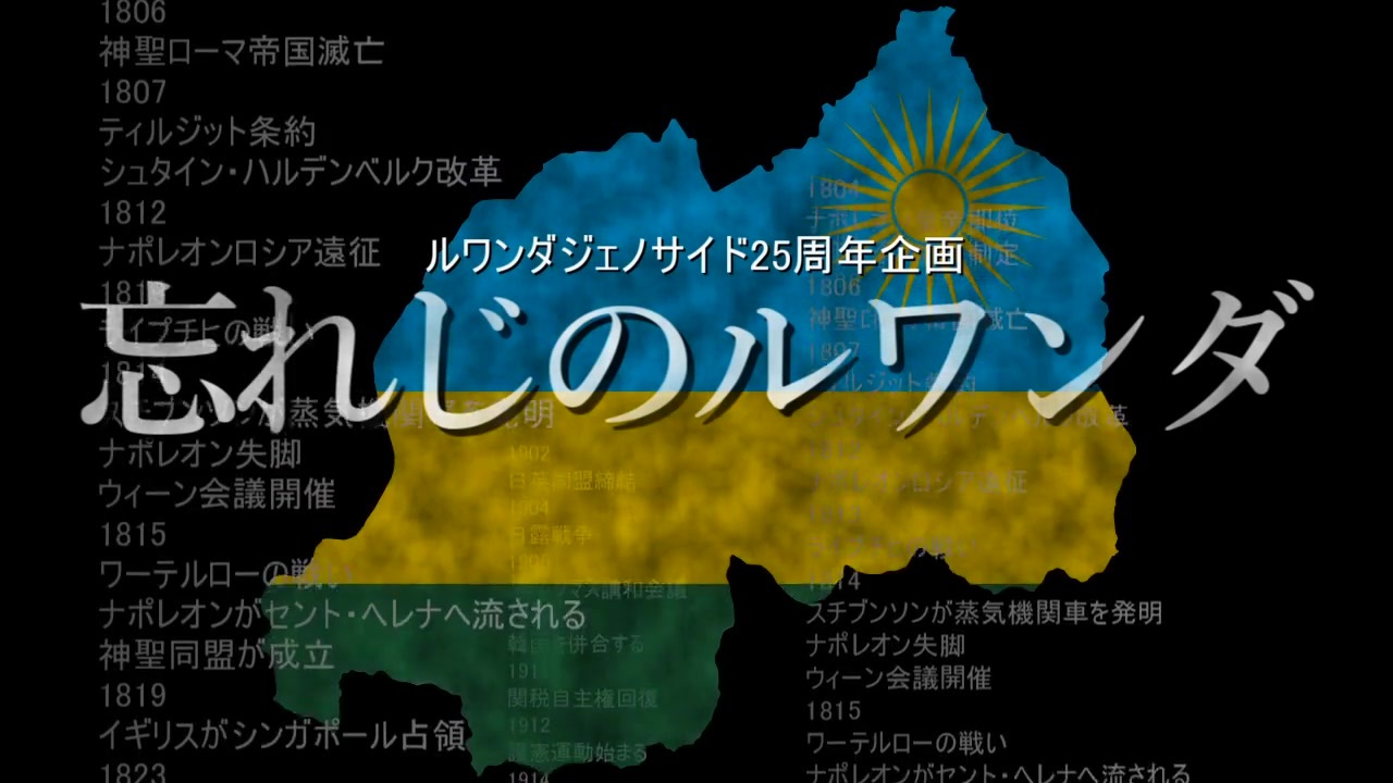 マイリスト <br>第二集 <a href="https://www.nicovideo.jp/watch/sm35497717" class="watch">sm35497717</a><br>1994年にルワンダで発生した「ルワンダ・ジェノサイド」から今年で25年。<br> ルワンダでは1994年4月6日からのわずか100日足らずで最低でも50万人、一説では100万人近くのツチ族とフツ族穏健派の人々が虐殺されました。<br>1994年4月6日からの100日間、ルワンダは地獄さながらの光景に覆いつくされました。<br>ルワンダ・ジェノサイドでは軍や民兵のみならず多くの一般市民までもが鉈を手に取り、隣人を惨殺したのです。<br>この動画シリーズではなぜ虐殺が起こったのか、最新の研究に基づき、ルワンダという国の成り立ちまでさかのぼり、ジェノサイドに至ったその過程と原因を再確認し、そして25年前のその時、ルワンダで何が起こっていたのかを生存者の声を交え明らかにしていきたいと思います。<br>