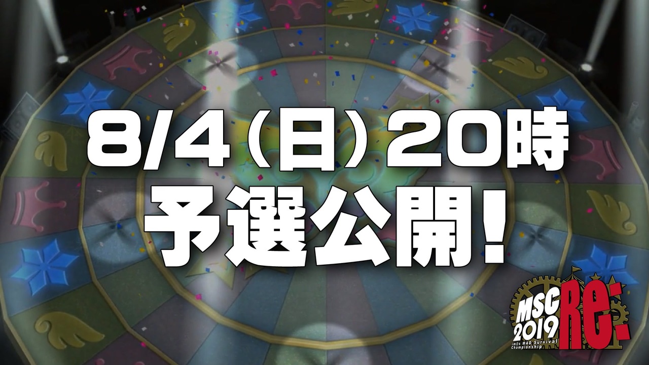 告知動画:阿羅他<br>Remix:めかおん <br><br>「15秒」「30秒」「60秒」で生き残れ!!<br>あの視聴者参加型ニコマスイベント「MSC」が帰ってきた!<br><br>名前を伏せた状態で15秒の動画を見た視聴者が「もっと長く見たい」動画に投票!<br>得票数上位の動画が「30秒本選」そして「60秒決勝戦」に勝ち進みます!<br>最後に栄光を手にするのは……………誰か!?<br><br>いよいよ明日8/4(日)20:00に予選が公開されます!<br>投票フォーム:予選動画公開と同時に公開します!<br>ご参加、ご視聴、お待ちしております!<br><br>●予選: 2019年8月4日(日) 20:00 公開&投票開始<br>●本選:2019年8月17日(土) 20:00 公開&投票開始<br>●敗者復活戦:2019年8月17日(土) 20:00 投票開始<br>●決勝:2019年9月1日(日) 20:00 公開&投票開始<br>●フィナーレ:2019年9月15日(日) 20:00 公開<br><br><br><span style="color: #262626; font-size: 13px;">◆上位作品発表(第1位~第3位発表)<a href="https://www.nicovideo.jp/watch/sm35684916" class="watch">sm35684916</a><br>◆カーテンコール(全制作者コメント紹介)<a href="https://www.nicovideo.jp/watch/sm35684312" class="watch">sm35684312</a></span><br><br><br><span style="font-size: 18px;">【MSC2019Re:データ公開のお知らせ】</span><br><br><span style="color: #262626; font-size: 13px;">MSC2019Re: 投票データまとめ1:予選<br><a href="https://ch.nicovideo.jp/article/ar1812247" target="_blank" rel="noopener">ar1812247</a><br><br>MSC2019Re: 投票データまとめ2:本選&敗者復活<br><a href="https://ch.nicovideo.jp/article/ar1812250" target="_blank" rel="noopener">ar1812250</a><br><br>MSC2019Re: 投票データまとめ3:決勝<br><a href="https://ch.nicovideo.jp/article/ar1812251" target="_blank" rel="noopener">ar1812251</a><br></span><br><br> <br>詳細は公式ブロマガから!<br><a href="https://ch.nicovideo.jp/article/ar1754905" target="_blank" rel="noopener">ar1754905</a><br><br>*公式マイリスト<br><a href="https://www.nicovideo.jp/mylist/66070911" target="_blank" rel="noopener">mylist/66070911</a><br><br>*MSCとは<br><a href="https://dic.nicovideo.jp/a/im%40s%20mad%20survival%20championship" target="_blank" rel="noopener nofollow">https://dic.nicovideo.jp/a/im%40s%20mad%20survival%20championship</a><br><br>*過去大会<br>im@sMSC ⇒ <a href="https://www.nicovideo.jp/mylist/3530533" target="_blank" rel="noopener">mylist/3530533</a><br>im@sMSC2 ⇒ <a href="https://www.nicovideo.jp/mylist/4996475" target="_blank" rel="noopener">mylist/4996475</a><br>im@sMSC3 ⇒ <a href="https://www.nicovideo.jp/mylist/8279914" target="_blank" rel="noopener">mylist/8279914</a><br>im@sMSC4 ⇒ <a href="https://www.nicovideo.jp/mylist/30300924" target="_blank" rel="noopener">mylist/30300924</a><br>im@sMSC5 ⇒ <a href="https://www.nicovideo.jp/mylist/52227913" target="_blank" rel="noopener">mylist/52227913</a>