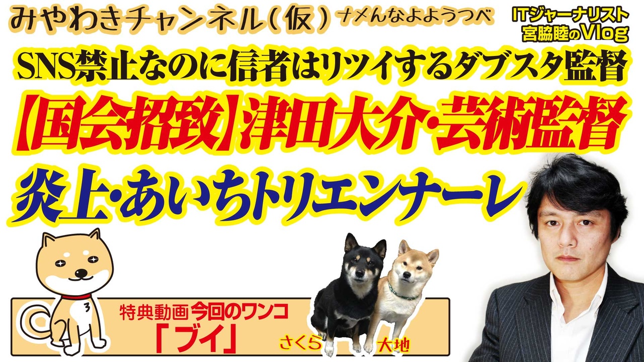 0:07 朝日新聞が「イアーン」とポロリしている<br>2:25 中止に反対。津田氏と関係者の処遇は?<br>5:04 津田さんに国会で「芸術」を語ってもらう<br>7:40 違法ダウンローダーから時代の寵児の幼児<br>10:25 SNS禁止なのにリツイする津田芸術監督<br>13:42 今回のワンコ「ブイ」<br><br>みやわきチャンネル(仮)<br>(旧・マスコミでは言えないこと)<br>オリジナル2019年8月3日配信<br><br>番組の最後に「柴犬」のコーナーがあります。<br><br><br>■わんこ総集編はこちらから!<br>何かあっても大丈夫、のはず。仮にこの「ワンコチャンネル」になにかあれば・・・オッス、○○と。<br>今回のワンコ総集編〜さくら&大地〜<br><a href="https://www.youtube.com/channel/UChwY..." target="_blank" rel="noopener nofollow">https://www.youtube.com/channel/UChwY...</a><br><br>■ニコニコ動画<br><a href="http://www.nicovideo.jp/user/13610165" target="_blank" rel="noopener nofollow">http://www.nicovideo.jp/user/13610165</a><br>■FRESH LIVE<br><a href="https://freshlive.tv/miyawaki-ch" target="_blank" rel="noopener nofollow">https://freshlive.tv/miyawaki-ch</a><br>■FC2動画<br><a href="https://video.fc2.com/account/16696711" target="_blank" rel="noopener nofollow">https://video.fc2.com/account/16696711</a><br>■YouTube(理不尽に消えることあり)<br><a href="https://www.youtube.com/c/AtsushiMiyawaki" target="_blank" rel="noopener nofollow">https://www.youtube.com/c/AtsushiMiyawaki</a><br><br>■いつ「消える」かわかりません。<br>そこでオフィシャルサイトで「非常用連絡先」をご確認ください。<br>「みやチャン(仮)」公式サイト「MiyawakiNewsNetwork」<br><a href="http://www.miyawakiatsushi.net" target="_blank" rel="noopener nofollow">http://www.miyawakiatsushi.net</a><br><br>■理不尽に消えたとき、以下で情報配信しております。ぜひ、ご登録ください。<br><br>■ツイッター<br><a href="https://twitter.com/miyawakiatsushi" target="_blank" rel="noopener nofollow">https://twitter.com/miyawakiatsushi</a><br>■Facebook<br><a href="https://www.facebook.com/miyawakiatsushi" target="_blank" rel="noopener nofollow">https://www.facebook.com/miyawakiatsushi</a>