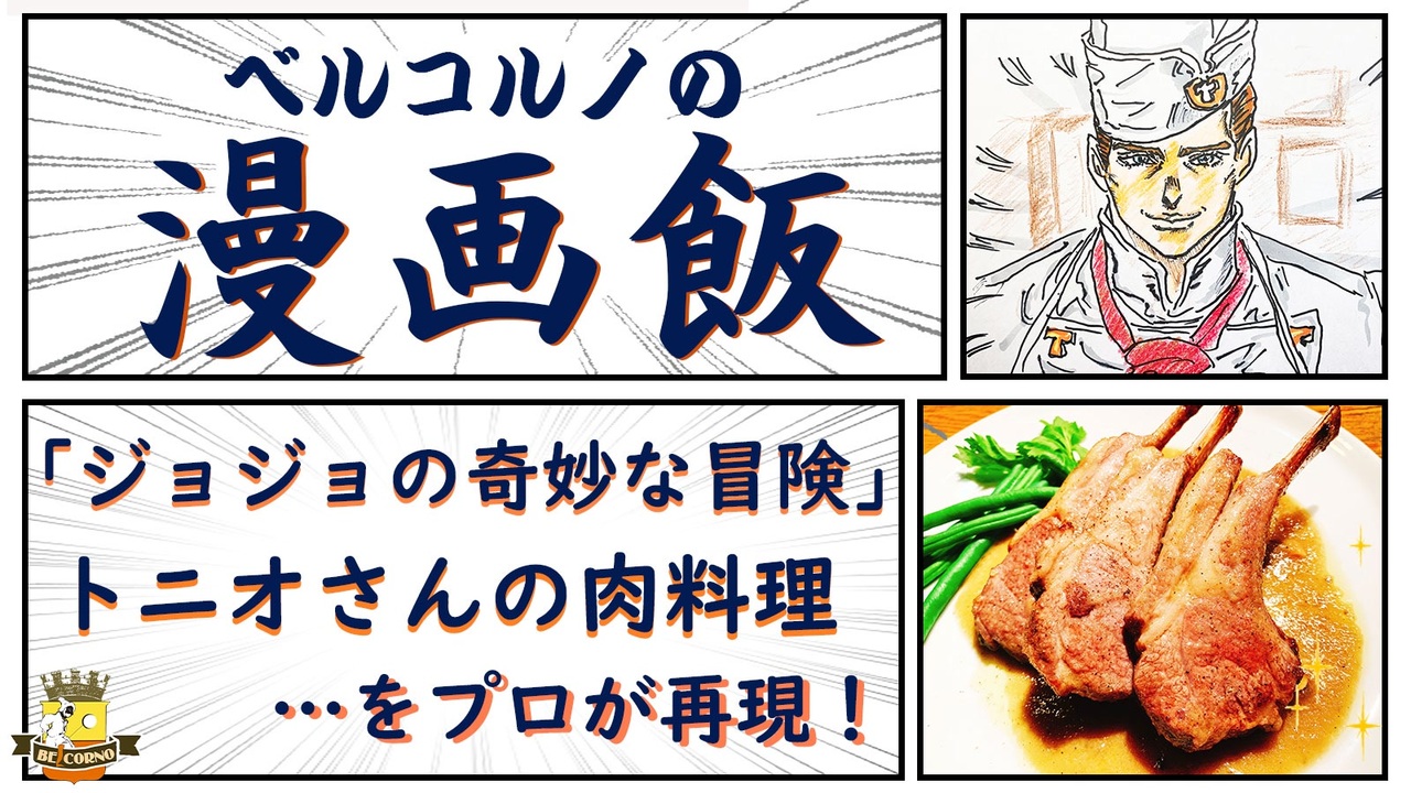 <span style="color: #000000; font-size: 14px;">シェフが漫画・アニメ・映画に出てくる料理やスイーツを再現する「ベルコルノの漫画飯」。<br><br>【漫画飯】リスト:</span><span style="color: #006699; font-size: 14px;"><a href="https://www.nicovideo.jp/my/mylist/#/66008633" target="_blank" rel="noopener nofollow">https://www.nicovideo.jp/my/mylist/#/66008633</a></span><br><br><br><span style="color: rgba(0, 0, 0, 0.8); font-size: 16px;"> 今回は、「ジョジョの奇妙な冒険」第4部(ダイヤモンドは砕けない)に出てくる、杜王町「トラサルディー」のシェフ・トニオさんのコース料理のメインディッシュ「小羊背肉のリンゴソースかけ」を再現します。トニオさんのコース料理再現は、前菜、パスタに続いて3品目です。 <br><br> 原作では億泰のお腹の調子が治る料理ですが、実はこちらの料理は、途中で仗助の横槍が入ったため、トニオさんの手で直接提供されていません。そのため、前の2品とは違い原作の中で材料の紹介がされていません。<br><br> 必然的に、こちらの料理再現にあたっては、「トニオさんならこう作っただろう」という予測のもとに進めていくことになります。トニオさんの料理は、前の2品で「出身地である南イタリアの料理」「スタンダードな調理法」「杜王町(宮城県)の食材利用」という、ハッキリとした傾向が見て取れるため、食べた億泰やトニオさん本人のコメント、原作の絵柄と合わせることで、ある程度の推測が可能です。<br><br> トニオさんの肉料理への、僕なりの回答という形で作ってみましたが、食べてみた結果、とても美味しくてびっくりしました(笑)メニューに入れようかな。。。。<br><br> 再現に当たって惜しむらくは、付け合せに用意していたアスパラをディナーの営業で使い切ってしまったため、代用品としてインゲン豆を使うことになったことです。ここはちょっと自分でも悔いが残るところです。でもまぁ、営業が優先。<br><br> レシピ自体は比較的シンプルですが、リンゴが沢山の水分を含むため、味付けは少し難しいです。ポイントは、味がボケないようにビビらずにしっかりと塩胡椒を振ることです。</span>