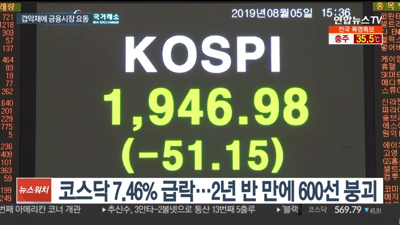 [アンカー]<br>米中貿易紛争と日本の経済報復余波で金融市場が揺れ走った。<br>コスダックはなんと7%以上暴落したコスピも1,950線が崩れ3年ぶりに最低値だったんです。<br>ウォン・ドル為替レートも1200ウォン台を突破し上昇しました。<br><br>イ・スングク記者です。<br><br>[記者]<br>対外悪材料が重なり、今日一日の金融市場が乱高下でした。<br>まず、株式市場は、「ブラックマンデー」という言葉ぎこちないしない程度にコスピとコスダックすべて急落しました。<br>特に、コスダック指数はなんと7%以上落ちた569.79で場を終えました。<br>コスダック指数が600ラインの下に落ちたのは2017年3月以降、2年5ヶ月ぶりです。<br>午後2時を少し超え先物価格の急落のせいで3年ぶりに5分間プログラム売り号効力を停止する「サイドカー」が発動されることもしました。<br>コスピも先週金曜日より2.5%以上急落し1,946.98で取引を終えました。<br><br>2016年6月以降、3年1ヶ月ぶりの最低値です。<br><br>株式市場の急落は、米国と中国の貿易紛争が激化の様相を見せ恐れが大きくなる中で、日本の経済報復が本格化している影響まで加わったことで見えます。<br>ここでコスダック製薬・バイオメーカーから否定的な臨床試験の結果が出たこともコスダック急落の原因の一つとしてプールされます。<br>日本の日経指数も1.7%以上低下などのアジア主要国の証券市場も下落を見せました。<br>証券市場の暴落だけでなく、ウォン・ドル為替レートも上昇しました。<br>一日に17.3ウォンも走った1,215.3ウォンで取引を終え、3年5ヶ月ぶりに最高値を記録しました。<br>1ドルが1200ウォンを超えたのは2年7ヶ月ぶりに初めてです。<br><br>聯合ニュースTVのイ・スングクです。
