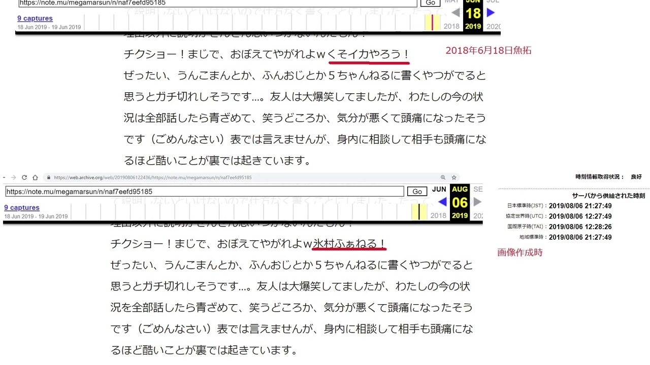 スレ魚拓<br><a href="https://web.archive.org/save/https://may.2chan.net/b/res/659558696.htm" target="_blank" rel="noopener nofollow">https://web.archive.org/save/https://may.2chan.net/b/res/659558696.htm</a><br><br>2019年6月18日<br>>チクショー!まじで、おぼえてやがれよwくそイカやろう!<br><a href="https://web.archive.org/web/20190618135342/https://note.mu/megamarsun/n/naf7eefd95185" target="_blank" rel="noopener nofollow">https://web.archive.org/web/20190618135342/https://note.mu/megamarsun/n/naf7eefd95185</a><br>2019年8月6日<br>>チクショー!まじで、おぼえてやがれよw氷村ふぁねる!<br><a href="https://web.archive.org/web/20190806122436/https://note.mu/megamarsun/n/naf7eefd95185" target="_blank" rel="noopener nofollow">https://web.archive.org/web/20190806122436/https://note.mu/megamarsun/n/naf7eefd95185</a><br><br><br><br>生存報告から冷奴<br>榊さんのついったーろぐでーたRT抜きで確認すると最後のツイートが2019-06-12 04:30:31<br>+4日+2日して生存報告が2019-06-18なので榊さんが「会社」に運ばれたのは12日の04:30:31以降と推測<br>ここから榊さんは「会社」で4日間床に寝かされた状態でさらに2日間は糞塗れの状態だった<br>ヒに会社の写真とアカウントの管理が離れた報告が投下されたのは2019-06-14 08:50:15<br>この時ツイッター上でずん子の活動を報告しているが2019-06-11 04:51:41にツイッター上でのずん子の活動を休止することを宣言している<br><br>冷奴つづき<br><br>>今回、わたしの死亡説やアカウントのっとり疑惑が話題となったことは知ってましたが、現在すでにツイッターアカウントはマネジメント会社にわたしており、わたしはログイン出来ません。<br>何故現場にいる(「会社」の仕事環境を撮影している)マネジメント会社にその場で疑惑に対する声明を出してくれるようお願いできなかったのか?<br>>これは、とりあげられたのではなく、自分からお願いしました。このブログについては、まだわたしがログインできます。こちらも近いうちに移譲する予定です。<br>>入院先ではスマホもあずけて、入院中ネット断ちをすることになります。<br>ツイッター依存症のための入院で手元にスマホもないのに何故noteのアカウントまで移譲するのか?<br>退院後に榊さんが情報を発信できる場所なくなってない?<br><br>>榊氏のnoteソースに更新日出てたわ<br>>>"dateModified":"2019-08-06T20:07:18.000+09:00"<br>>今日の20:07:18更新だね