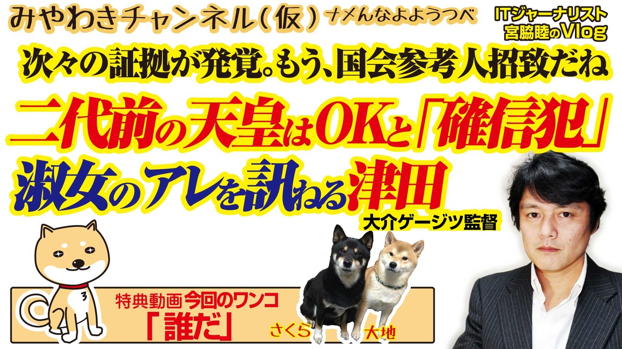 <br>0:07 原爆忌を語らないテレビと検証するネット<br>2:42 新企画「津田×東」の確信犯対談を再現<br>6:26 道新で「俺様理論」を語る津田芸術監督<br>8:50 ルリにセクなハラ発言をしていた津田監督<br>10:37 大村愛知知事、憲法は捏造や嘘を守らない<br>13:13 今回のワンコ「誰だ」<br><br><br>みやわきチャンネル(仮)#536Restart395<br>(旧・マスコミでは言えないこと)<br>オリジナル2019年8月6日配信<br><br>番組の最後に「柴犬」のコーナーがあります。<br>今回のワンコ「誰だ」<br><br>■わんこ総集編はこちらから!<br>何かあっても大丈夫、のはず。仮にこの「ワンコチャンネル」になにかあれば・・・オッス、○○と。<br>今回のワンコ総集編〜さくら&大地〜<br><a href="https://www.youtube.com/channel/UChwY..." target="_blank" rel="noopener nofollow">https://www.youtube.com/channel/UChwY...</a><br><br>■ニコニコ動画<br><a href="http://www.nicovideo.jp/user/13610165" target="_blank" rel="noopener nofollow">http://www.nicovideo.jp/user/13610165</a><br>■FRESH LIVE<br><a href="https://freshlive.tv/miyawaki-ch" target="_blank" rel="noopener nofollow">https://freshlive.tv/miyawaki-ch</a><br>■FC2動画<br><a href="https://video.fc2.com/account/16696711" target="_blank" rel="noopener nofollow">https://video.fc2.com/account/16696711</a><br>■YouTube(理不尽に消えることあり)<br><a href="https://www.youtube.com/c/AtsushiMiyawaki" target="_blank" rel="noopener nofollow">https://www.youtube.com/c/AtsushiMiyawaki</a><br><br>■いつ「消える」かわかりません。<br>そこでオフィシャルサイトで「非常用連絡先」をご確認ください。<br>「みやチャン(仮)」公式サイト「MiyawakiNewsNetwork」<br><a href="http://www.miyawakiatsushi.net" target="_blank" rel="noopener nofollow">http://www.miyawakiatsushi.net</a><br><br>■理不尽に消えたとき、以下で情報配信しております。ぜひ、ご登録ください。<br><br>■ツイッター<br><a href="https://twitter.com/miyawakiatsushi" target="_blank" rel="noopener nofollow">https://twitter.com/miyawakiatsushi</a><br>■Facebook<br><a href="https://www.facebook.com/miyawakiatsushi" target="_blank" rel="noopener nofollow">https://www.facebook.com/miyawakiatsushi</a><br><br><br><br><br>