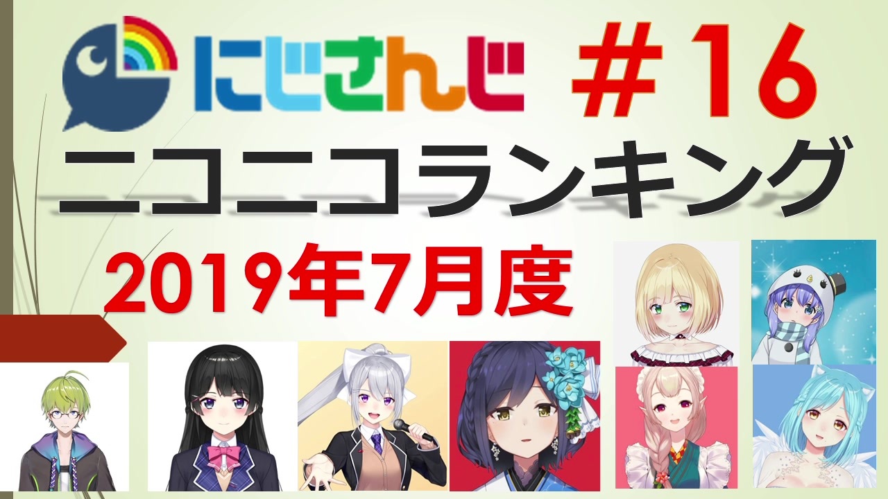 ■集計期間:2019年<span style="color: #ff0000; font-size: 18px;">7月1日</span><span style="color: #262626; font-size: 13px;">0時</span><span style="color: #262626; font-size: 16px;">~</span><span style="color: #ff0000; font-size: 18px;">7月31日</span><span style="font-size: 13px;">24時</span><br>■集計方法:再生数+(コメント数×補正値)+(マイリスト登録数×<span style="color: #ff0000;">25</span><span style="color: #262626;">)</span><br>■集計対象:タグ 「にじさんじ」がついている動画<br>──────<br>プレイリスト:<a href="https://www.nicovideo.jp/mylist/66215113" target="_blank" rel="noopener">mylist/66215113</a><br>──────<br><span style="color: #000000; font-size: 13px;">#12(3月度):</span><a href="https://www.nicovideo.jp/watch/sm34921916" class="watch">sm34921916</a><span style="color: #000000; font-size: 13px;"> | #13(4月度):</span><a href="https://www.nicovideo.jp/watch/sm35082932" class="watch">sm35082932</a><span style="color: #000000; font-size: 13px;">|<br>#14(5月度):</span><a href="https://www.nicovideo.jp/watch/sm35223033" class="watch">sm35223033</a><span style="color: #000000; font-size: 13px;"> | #15(6月度):</span><a href="https://www.nicovideo.jp/watch/sm35354932" class="watch">sm35354932</a><span style="color: #000000; font-size: 13px;">|<br>#16(7月度):いまここ |</span><br>──────<br><br>2019年7月度のランキングです。<br><br>このランキングでは<span style="color: #ff0000;"><u>「にじさんじ」のタグが付いている動画のみ</u></span><span style="color: #ff0000;">が集計対象となっています</span>。<br><br>全体的に音量が小さめになってしまっています…<br>