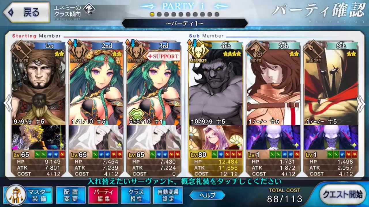 サロメの呪い、NPチャージを使った運用例です。<br>7ターン目までは特に何も無いですが一応フルで撮りました。<br>7ターン生存の参考にはなるかと…<br><br>孔明だと防御ダウンのせいで長く楽しめないので弁慶で代用。<br>スタンと呪いがあればいいのでそこまで差は無いです。<br>(呪いは孔明の方が高いですが雷帝が途中で落ちます…)<br><br>サンドバッグ雷帝…<br><br>※追記<br>あくまでロマン運用で確実性は無いです。<br>動画では使ってないですが雷帝は強化、弱体解除持ちです。<br>ブレイク持ちで剥がした直後に呪いで1にとか見てみたい。<br>↑誰かメインシナリオ等でやってみて欲しいです。<br><br>今回の弁慶枠の代用が可能なキャラ<br>・スカサハ(おすすめ)<br>・エルキドゥ(対神性なら)<br>・キルケー(豚化対象なら)雷帝は駄目だった…<br>・ジャンヌ(剥がれるのは防御バフ)<br>・始皇帝(無敵+タゲ取り)<br>など<br>上のキャラならスタンや無敵でサロメを守れます。<br><br>呪い増量版→(<a href="https://www.nicovideo.jp/watch/sm35520820" class="watch">sm35520820</a>)<br /><br>FGO高難易度Wサロメ攻略:<a href="https://www.nicovideo.jp/mylist/67807793" target="_blank" rel="noopener">mylist/67807793</a><br><br>Twitter:<a href="https://twitter.com/SwoRa_Kento" target="_blank" rel="noopener nofollow">https://twitter.com/SwoRa_Kento</a>