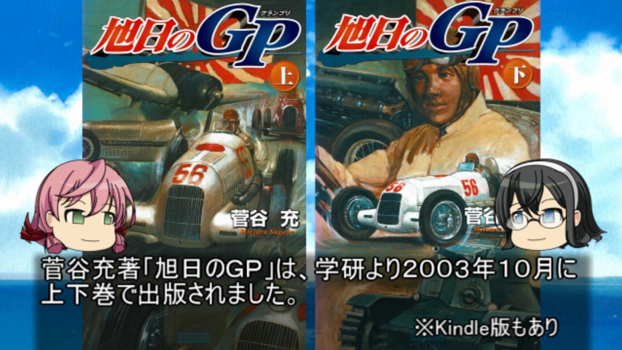 <strong>菅谷充著「旭日のGP」</strong><br><br>また、架空戦記と呼んでよいか判らぬものを紹介してしまった……。<br>タイトル通り、戦前のGP(グランプリ・レース)に日本人チームが参戦するストーリーです。<br>狭義の戦闘シーンと呼べるのはプロローグ部分にしかないので、人を選ぶというか、そもそも架空戦記を読みたい人に当時売れたのか、他人事ながら気になるところです。<br><br>前回「機密空母赤城」><a href="https://www.nicovideo.jp/watch/sm35057821" class="watch">sm35057821</a><br>次回「零戦大逆襲!」><a href="https://www.nicovideo.jp/watch/sm35674047" class="watch">sm35674047</a><br>マイリスト<a href="https://www.nicovideo.jp/mylist/57109690" target="_blank" rel="noopener">mylist/57109690</a><br><br><strong>2019/8/10 12:45追記</strong><br>現段階で確認できている誤字は以下の2か所<br><strong>・×コンチネルンタル ⇒ 〇コンチネンタル<br>・×類似 ⇒ 〇ルイジ</strong><br>他にもいろいろとミスってそうですが。
