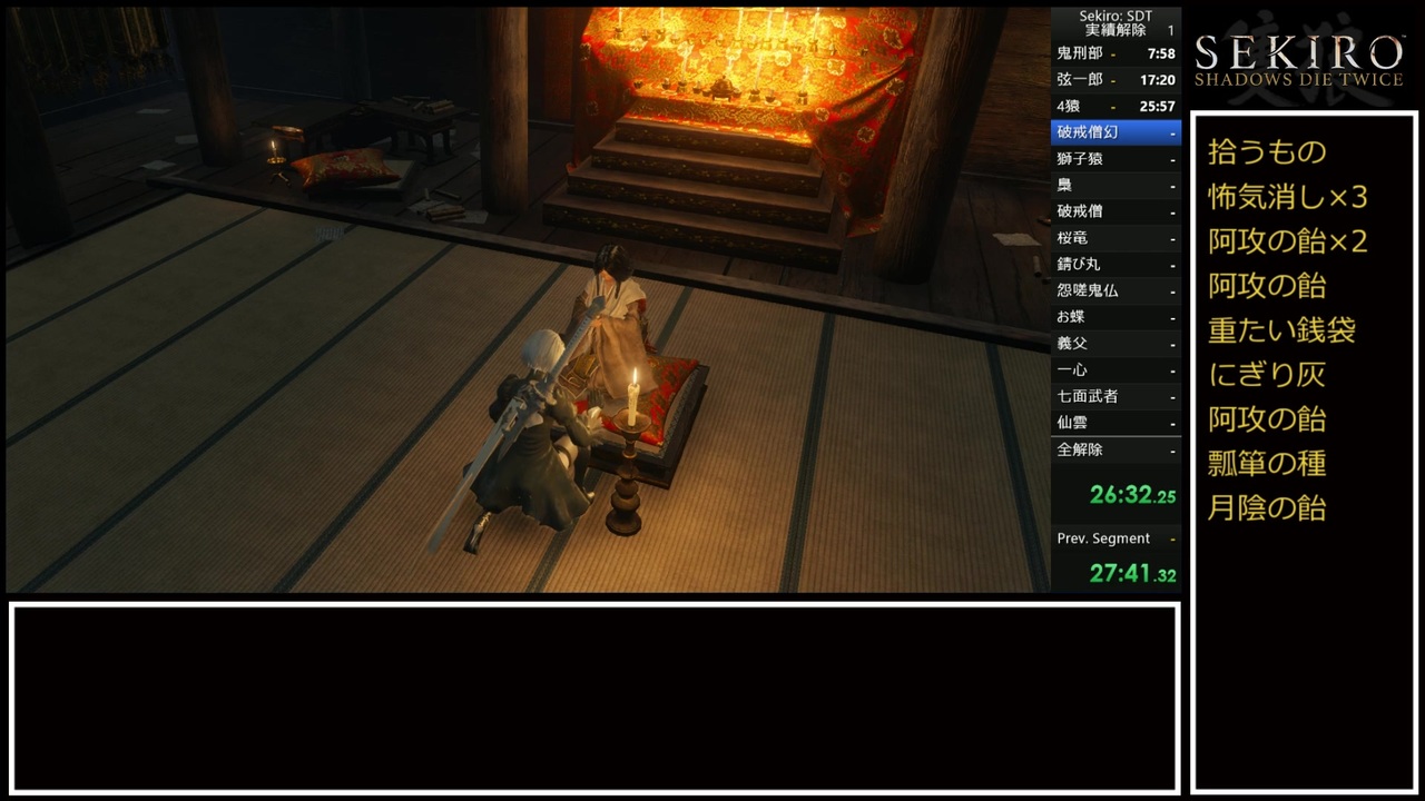 PC版SEKIROの実績解除をコンプするまでのRTA動画です。<br>タイムはIGTのため、厳密にはTAとなります。また、あくまで参考記録です。<br>レギュレーションはバグなしとなり、主なルールはspeedrunに準拠します。<br><br><a href="https://www.nicovideo.jp/watch/sm35509800" class="watch">sm35509800</a>←前 次→<a href="https://www.nicovideo.jp/watch/sm35519352" class="watch">sm35519352</a><br><a href="https://www.nicovideo.jp/mylist/66223978" target="_blank" rel="noopener">mylist/66223978</a><br><br>たこぱすさん etc.さん ヒラヒラさん 緑水さん 鍋焼きうどんさん 燈朱公さん<br>たくさんの広告、ご視聴ありがとうございます。<br><br>SEKIRO: SHADOWS DIE TWICE<br>(©2019 FromSoftware, Inc. All rights reserved. ACTIVISION is a trademark of Activision Publishing Inc. All other trademarks and trade names are the properties of their respective owners.)<br><br>使用MOD(レギュレーションで認められていない)<br>Native PS4 Buttons<br>YoRHa No.2 Type B (2B) from Nier:Automata<br>(The ablove model's rights was reserved by Square Enix & author of the Nier:Automata.)<br>2B voice japanese ver<br><br>