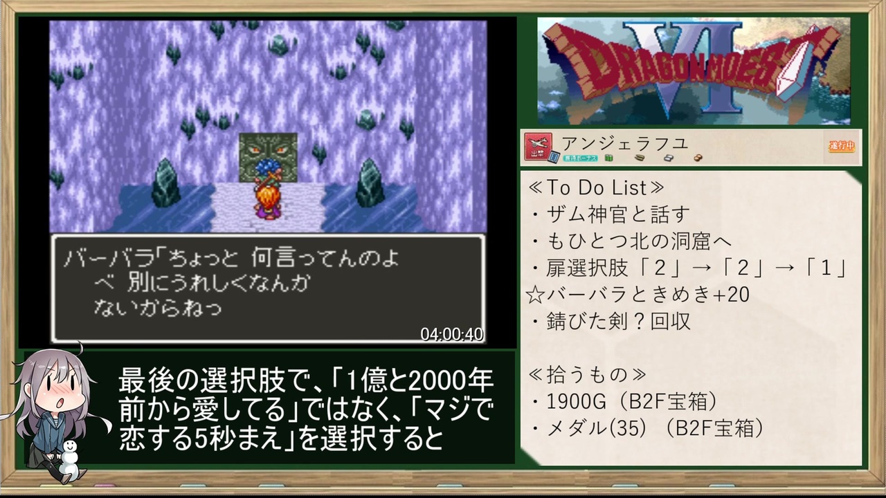 これが恋・・・なのかなぁ・・・<br><br>【GAME】 <br>ドラゴンモエストⅥ(Ver.1.5)<br>計測区間:ゲーム開始~THE END羽ペン消失まで<br>エミュ:SNES9X<br><br>【内容】<br>・バーバラエンド<br>・エミュのチート機能ほかバグの使用禁止<br>・淫夢要素なし<br>※ドラゴンクエスト6(DQ6)の改造ROMです<br><br>【<a href="https://www.nicovideo.jp/mylist/66082955" target="_blank" rel="noopener">mylist/66082955</a>】 <br>PREV≫<a href="https://www.nicovideo.jp/watch/sm35535354" class="watch">sm35535354</a><br>NEXT≫<a href="https://www.nicovideo.jp/watch/sm35555880" class="watch">sm35555880</a><br>Part.1≫<a href="https://www.nicovideo.jp/watch/sm35425017" class="watch">sm35425017</a><br><br>☆こちらもどうぞ★<br>前作≫56ターンでガリアを救う戦場のヴァルキュリア≫<a href="https://www.nicovideo.jp/watch/sm35127368" class="watch">sm35127368</a><br>other Cielo’s title <br>【<a href="https://www.nicovideo.jp/mylist/50418741" target="_blank" rel="noopener">mylist/50418741</a> 】<br><br>twitter <a href="https://twitter.com/Cielo_Polo" target="_blank" rel="noopener nofollow">https://twitter.com/Cielo_Polo</a>