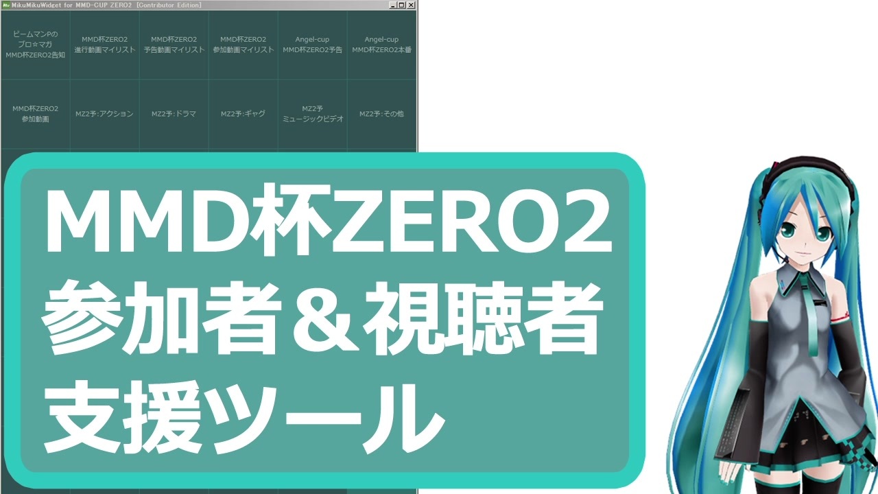 間もなく開催されるMMD杯ZERO2の参加作を、ニコニコでの検索を行わず素早く呼び出し巡回したり、動画制作に必要な素材の配布サイトやリンクをすぐ呼び出せるウィジェットを作ったよ!<br>ダウンロードはこちらからどうぞ。<br><a href="https://ugsf.org/storch/app" target="_blank" rel="noopener nofollow">https://ugsf.org/storch/app</a><br>参加者の方は MikuMikuWidget For MMD-CUP-ZERO2 Contributor Editionを<br>視聴者の方は MikuMikuWidget For MMD-CUP-ZERO2 Audience Editionをダウンロードしてね!<br>質問や要望は @storch_mmdまでどうぞ!<br>ソースコードはMITライセンスなのでGitHubからダウンロードして改造・再配布してもOKですよー。<br>Githubはこちら→<a href="https://github.com/storchP/python_project2019/tree/master" target="_blank" rel="noopener nofollow">https://github.com/storchP/python_project2019/tree/master</a><br>これまでの作品→<a href="https://www.nicovideo.jp/mylist/17021794" target="_blank" rel="noopener">mylist/17021794</a><br>9/24Update <span style="color: #252525; font-size: 14px;">MMD宣伝部さん、SodorP、cz0075さん、みや びやさん、ファルコンさん、夜月さん、黒犬さん、T-specさん、なゆ太郎さん、mさん、(゚∀゚) さん、駅伝P、kazeotoさん、抹茶スパさん、romiccoさん、ながれさん、cronusさん、文月礼楽さん、南瓜のたねさん、raisyuさん、詩歌さん、通りすがりの人さん、国鉄広報さん、もそっそさん、であご(Dear-Go)さん、雲母さん、ACG好きの異世界人さん、あるやさん、エコーさん、にゅさん、あおめがねさん、にるせんさん、no nameさん、ねこまんまおかわりさん、広告ありがとうございました!</span><br><br>