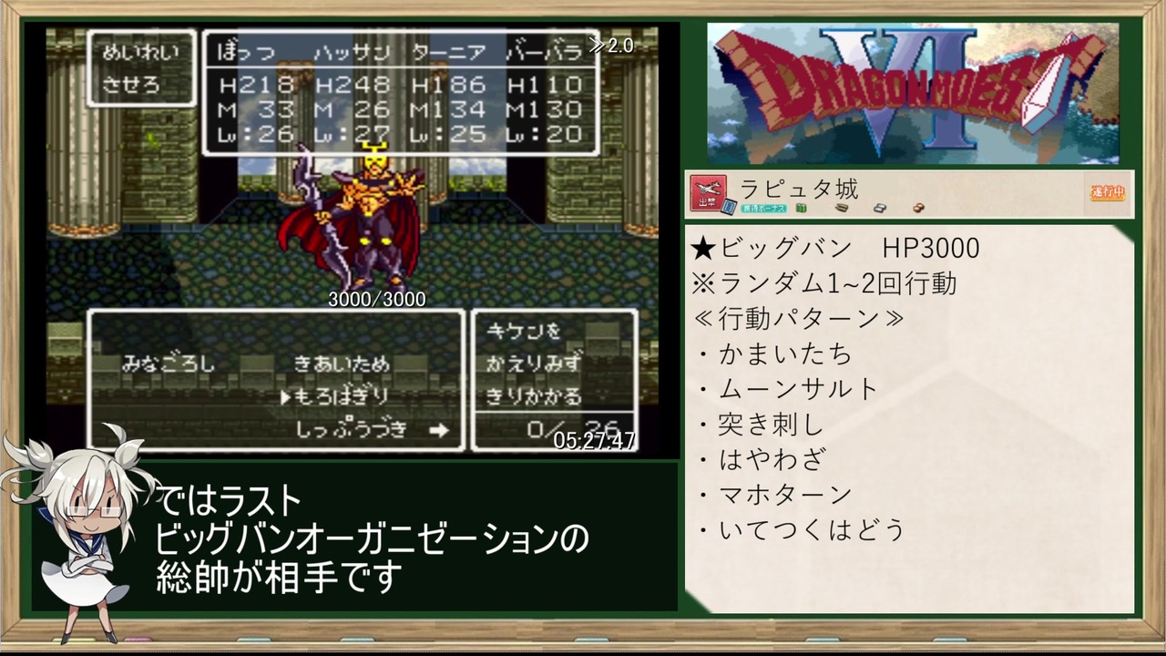 ラピュタはよみがえるさ!<br><br>【GAME】 <br>ドラゴンモエストⅥ(Ver.1.5)<br>計測区間:ゲーム開始~THE END羽ペン消失まで<br>エミュ:SNES9X<br><br>【内容】<br>・バーバラエンド<br>・エミュのチート機能ほかバグの使用禁止<br>・淫夢要素なし<br>※ドラゴンクエスト6(DQ6)の改造ROMです<br><br>【<a href="https://www.nicovideo.jp/mylist/66082955" target="_blank" rel="noopener">mylist/66082955</a>】 <br>PREV≫<a href="https://www.nicovideo.jp/watch/sm35555880" class="watch">sm35555880</a><br>NEXT≫<a href="https://www.nicovideo.jp/watch/sm35583430" class="watch">sm35583430</a><br><br>Part.1≫<a href="https://www.nicovideo.jp/watch/sm35425017" class="watch">sm35425017</a><br><br>☆こちらもどうぞ★<br>前作≫56ターンでガリアを救う戦場のヴァルキュリア≫<a href="https://www.nicovideo.jp/watch/sm35127368" class="watch">sm35127368</a><br>other Cielo’s title <br>【<a href="https://www.nicovideo.jp/mylist/50418741" target="_blank" rel="noopener">mylist/50418741</a> 】<br><br>twitter <a href="https://twitter.com/Cielo_Polo" target="_blank" rel="noopener nofollow">https://twitter.com/Cielo_Polo</a>