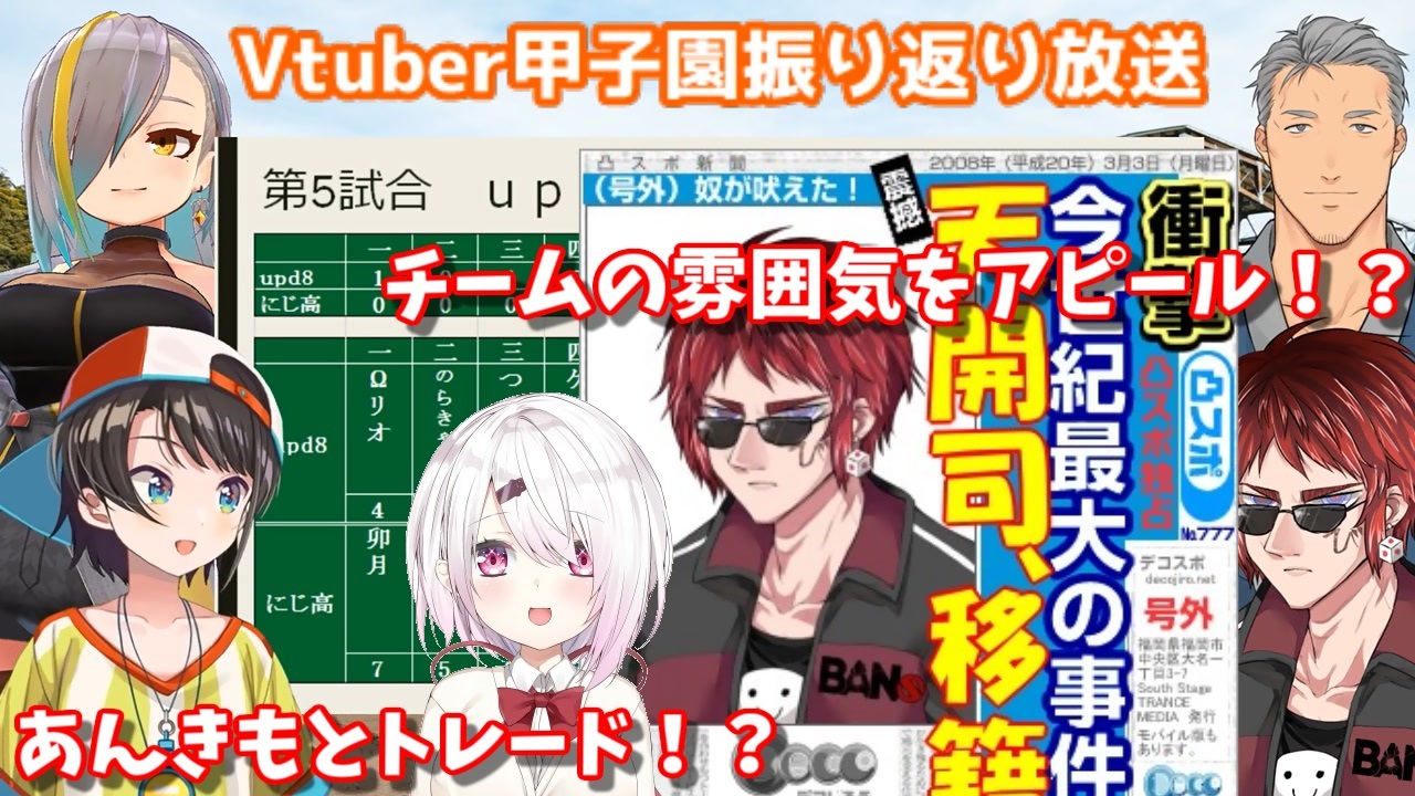 元動画:<span style="font-size: 16px;"><strong>【緊急集合】Vtuber甲子園振り返り放送【夏の思い出】</strong></span><br><a href="https://www.youtube.com/watch?v=oKT-ljZSxLU" target="_blank" rel="noopener nofollow">https://www.youtube.com/watch?v=oKT-ljZSxLU</a><br><br>・<strong>司会兼投手 天開司</strong><br><a href="https://www.youtube.com/channel/UCZYyhgoV314CM14zBD6vd4A" target="_blank" rel="noopener nofollow">https://www.youtube.com/channel/UCZYyhgoV314CM14zBD6vd4A</a><br><br>・<strong>にじさんじ高校 椎名唯華監督</strong><br><a href="https://www.youtube.com/channel/UC_4tXjqecqox5Uc05ncxpxg" target="_blank" rel="noopener nofollow">https://www.youtube.com/channel/UC_4tXjqecqox5Uc05ncxpxg</a><br><br>・<strong>にじさんじ農業 舞元啓介監督</strong><br><a href="https://www.youtube.com/channel/UCJubINhCcFXlsBwnHp0wl_g" target="_blank" rel="noopener nofollow">https://www.youtube.com/channel/UCJubINhCcFXlsBwnHp0wl_g</a><br><br>・<strong>ホロライブ女学院 大空スバル監督</strong><br><a href="https://www.youtube.com/channel/UCvzGlP9oQwU--Y0r9id_jnA" target="_blank" rel="noopener nofollow">https://www.youtube.com/channel/UCvzGlP9oQwU--Y0r9id_jnA</a><br><br>・<strong>upd8商業 歌衣メイカ監督</strong><br><a href="https://www.youtube.com/channel/UC7-N7MvN5muVIHqyQx9LFbA" target="_blank" rel="noopener nofollow">https://www.youtube.com/channel/UC7-N7MvN5muVIHqyQx9LFbA</a><br>
