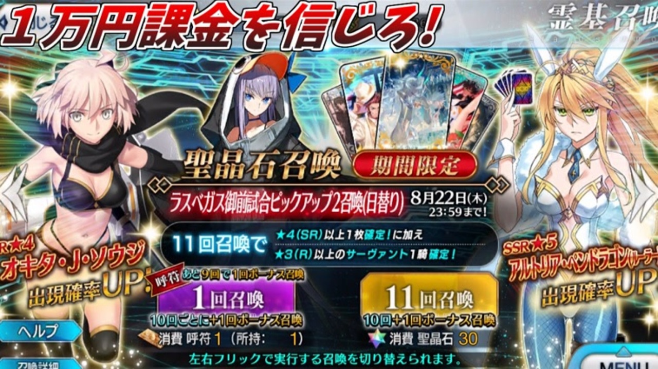 水着沖田さん引いて大勝利したい、今回も1万円課金で挑みます。<br><br><span style="color: #000000; font-size: 14px;">前→</span><a href="https://www.nicovideo.jp/watch/sm35541431" class="watch">sm35541431</a><span style="color: #000000; font-size: 14px;"> 次→</span><a href="https://www.nicovideo.jp/watch/sm35589556" class="watch">sm35589556</a><br><br><span style="color: #000000;">【FGOマイリス】</span><span style="color: #006699; font-size: 14px;"><a href="https://www.nicovideo.jp/mylist/63054982" target="_blank" rel="noopener">mylist/63054982</a></span><span style="color: #000000; font-size: 14px;"> </span><br><span style="color: #000000; font-size: 13px;">【チャンネル】</span><span style="color: #006699; font-size: 14px;"><a href="https://ch.nicovideo.jp/ainosensi" target="_blank" rel="noopener">ch.nicovideo.jp/ainosensi</a></span><br><span style="color: #000000; font-size: 14px;">【その他投稿作品】</span><span style="color: #006699; font-size: 14px;"><a href="https://www.nicovideo.jp/mylist/34427287" target="_blank" rel="noopener">mylist/34427287</a></span><span style="color: #000000; font-size: 14px;"> 【Twitter】@ainosensi2</span><br><span style="color: #000000; font-size: 13px;">【サブ垢】</span><span style="color: #006699; font-size: 14px;"><a href="https://www.nicovideo.jp/user/52667187" target="_blank" rel="noopener">user/52667187</a></span><span style="color: #000000; font-size: 14px;"> </span><br><span style="color: #000000;">【YOUTUBE】</span><span style="color: #006699; font-size: 14px;"><a href="http://goo.gl/OMphlA" target="_blank" rel="noopener nofollow">http://goo.gl/OMphlA</a></span>