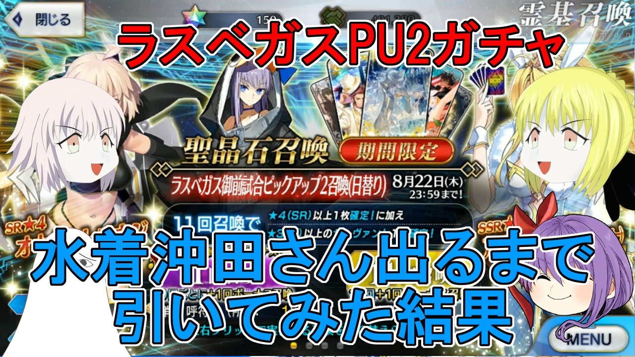 ラスベガスPU2です。<br>今回は水着沖田さんが出る迄引きました。<br><br>動画についてリクエスト等ありましたらコメントやTwitter等にご連絡頂ければ可能な限り検討致します。<br>御用の際には下記アドレスまで宜しくお願いします。<br>連絡先メールアドレス → cecimesfr@gmail.com<br>Twitter → <a href="https://twitter.com/Ceci_startnow" target="_blank" rel="noopener nofollow">https://twitter.com/Ceci_startnow</a><br>今回の動画の音楽は「魔王魂様」「D-elf様」「甘茶の音楽工房様」からお借りしています<br><br><span style="color: #111111;">前回の動画→</span><a href="https://www.nicovideo.jp/watch/sm35573780" class="watch">sm35573780</a><span style="color: #111111;"> 次回の動画→</span><a href="https://www.nicovideo.jp/watch/sm35580499" class="watch">sm35580499</a><br><u><a href="https://www.nicovideo.jp/mylist/60420393" target="_blank" rel="noopener">mylist/60420393</a></u><br><br>↓水着武蔵宝具5チャレンジ↓<br><u><a href="https://www.nicovideo.jp/mylist/66276634" target="_blank" rel="noopener">mylist/66276634</a></u><br><br>↓邪ンヌ宝具5チャレンジ↓<br><u><a href="https://www.nicovideo.jp/mylist/65709199" target="_blank" rel="noopener">mylist/65709199</a></u>