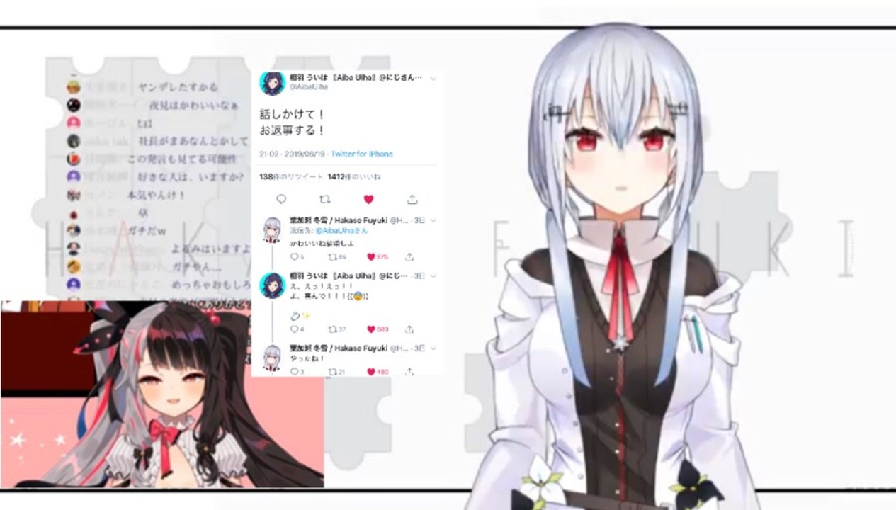 <span style="font-size: 12pt;">社長は百合に挟まれる男という立ち位置でよろしいかな?</span><br><br><br><br><br>葉加瀬の件(くだん)のツイート<br><a href="https://twitter.com/hakase_fuyuki/status/1163421189953294338?s=21" target="_blank" rel="noopener nofollow">https://twitter.com/hakase_fuyuki/status/1163421189953294338?s=21</a><br><br>◯本編<br>【雑談】マシュマロとか雑談とか最近あったことの話【にじさんじ/葉加瀬冬雪】<br><a href="https://youtu.be/DhXN4S6tNak" target="_blank" rel="noopener nofollow">https://youtu.be/DhXN4S6tNak</a><br><br>◯葉加瀬冬雪<br>YouTubeチャンネル <a href="https://www.youtube.com/channel/UCGYAYLDE7TZiiC8U6teciDQ" target="_blank" rel="noopener nofollow">https://www.youtube.com/channel/UCGYAYLDE7TZiiC8U6teciDQ</a><br>ツイッター <a href="https://twitter.com/Hakase_Fuyuki" target="_blank" rel="noopener nofollow">https://twitter.com/Hakase_Fuyuki</a><br><br>◯夜見れな<br>YouTubeチャンネル <a href="https://www.youtube.com/channel/UCL34fAoFim9oHLbVzMKFavQ" target="_blank" rel="noopener nofollow">https://www.youtube.com/channel/UCL34fAoFim9oHLbVzMKFavQ</a><br>ツイッター <a href="https://mobile.twitter.com/rena_yorumi" target="_blank" rel="noopener nofollow">https://mobile.twitter.com/rena_yorumi</a><br>切り抜きマイリスト<a href="https://www.nicovideo.jp/mylist/66205509" target="_blank" rel="noopener">mylist/66205509</a><br><br>◯相羽ういは<br>YouTubeチャンネル <a href="https://www.youtube.com/channel/UCnRQYHTnRLSF0cLJwMnedCg" target="_blank" rel="noopener nofollow">https://www.youtube.com/channel/UCnRQYHTnRLSF0cLJwMnedCg</a><br>ツイッター <a href="https://twitter.com/AibaUiha" target="_blank" rel="noopener nofollow">https://twitter.com/AibaUiha</a><br><br><br>☆いつもニコニ広告、本当にありがとうございます!都度のお礼ができていませんが、いつもニコレポから見てありがてえ…ありがてえ…と思っています!!<br><br>※YouTubeなどへの無断転載はご遠慮ください。<br><br>※当動画はにじさんじ二次創作ガイドラインに準拠して作成しています。 <br>◯にじさんじ二次創作ガイドライン <br><a href="https://event.nijisanji.app/guidelines/" target="_blank" rel="noopener nofollow">https://event.nijisanji.app/guidelines/</a><br><br>#葉加瀬冬雪<br>#夜見れな<br>#相羽ういは<br>#にじさんじ