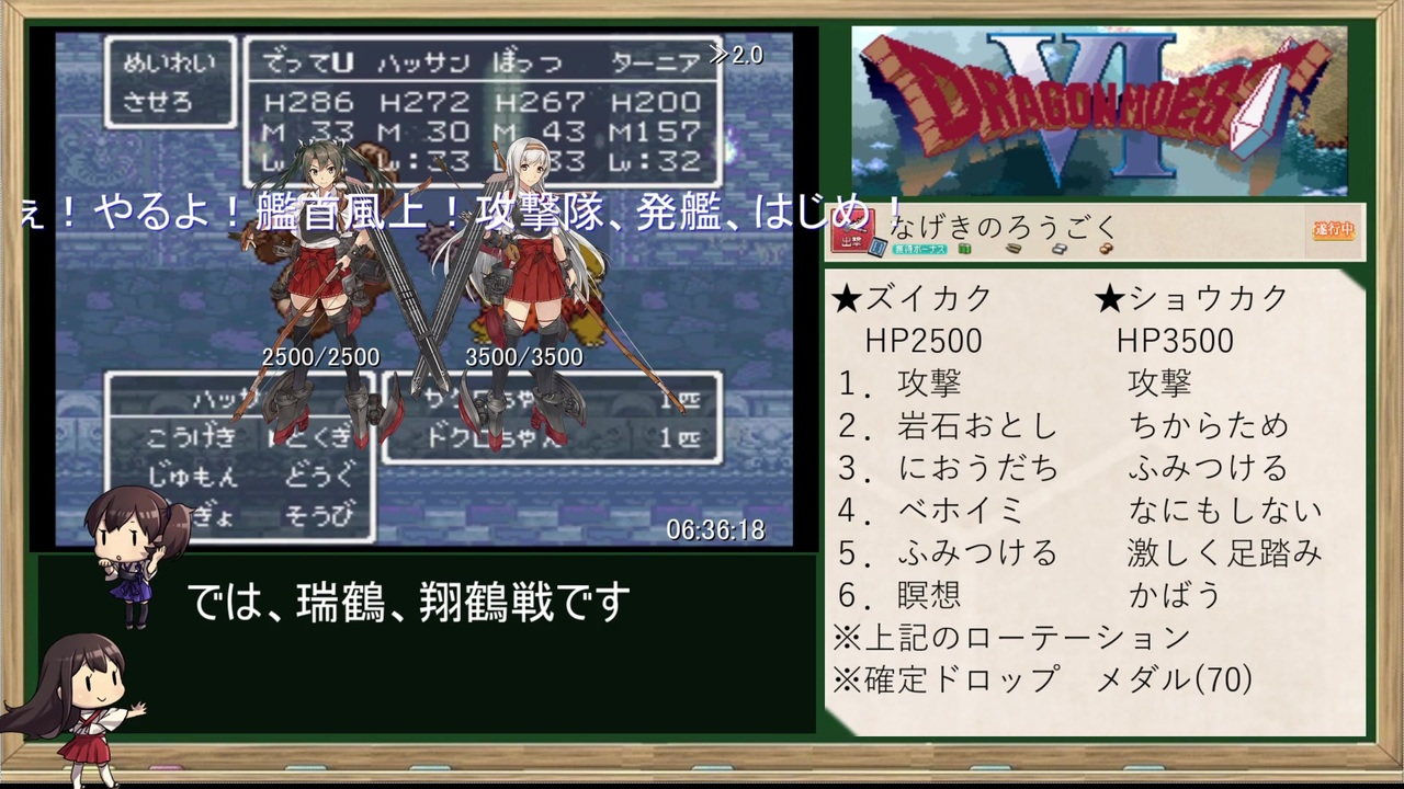 艦これ回<br><br>【GAME】 <br>ドラゴンモエストⅥ(Ver.1.5)<br>計測区間:ゲーム開始~THE END羽ペン消失まで<br>エミュ:SNES9X<br><br>【内容】<br>・バーバラエンド<br>・エミュのチート機能ほかバグの使用禁止<br>・淫夢要素なし<br>※ドラゴンクエスト6(DQ6)の改造ROMです<br><br>【<a href="https://www.nicovideo.jp/mylist/66082955" target="_blank" rel="noopener">mylist/66082955</a>】 <br>PREV≫<a href="https://www.nicovideo.jp/watch/sm35565168" class="watch">sm35565168</a><br>NEXT≫<a href="https://www.nicovideo.jp/watch/sm35613469" class="watch">sm35613469</a><br><br>Part.1≫<a href="https://www.nicovideo.jp/watch/sm35425017" class="watch">sm35425017</a><br><br>☆こちらもどうぞ★<br>前作≫56ターンでガリアを救う戦場のヴァルキュリア≫<a href="https://www.nicovideo.jp/watch/sm35127368" class="watch">sm35127368</a><br>other Cielo’s title <br>【<a href="https://www.nicovideo.jp/mylist/50418741" target="_blank" rel="noopener">mylist/50418741</a> 】<br><br>twitter <a href="https://twitter.com/Cielo_Polo" target="_blank" rel="noopener nofollow">https://twitter.com/Cielo_Polo</a>