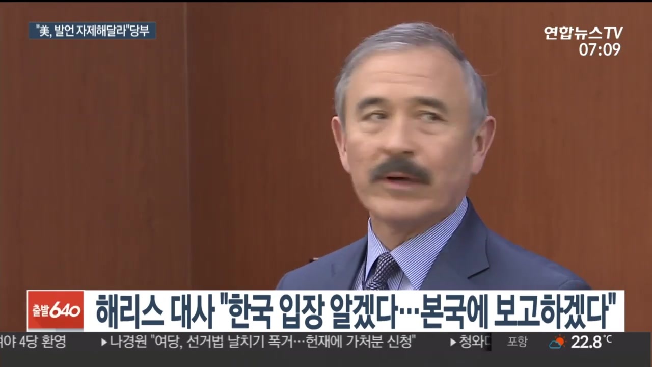 KBSの報道では、ハリス大使の心境が全く分からなかったのですが・・・予定されていた「在郷軍人会での講演」をキャンセルして帰ってしまったという聯合ニュースの報道で、お察し申し上げます。ハリス大使は相当に「怒り心頭」だった気持ちを悟らせずに、記者団に紳士的に振るまう姿は流石です・・・お子持ちお察し申し上げます。<br><br>聯合ニュースのGoogle翻訳です。<br>[アンカー]<br>韓日情報保護協定、GSOMIA終了と独島防衛訓練に米国が相次いで非難発言を行っています。<br>韓国政府も言うことは言いました。<br>ハリーハリス駐韓米国大使を呼んで自制を呼びかけたんです。<br><br>知性リム記者です。<br>[記者]<br><br>ジョセヨウン外交部第1次官はハリー・ハリス駐韓米国大使を外交部庁舎に呼びました。<br>外交部はジョー次官がハリス大使と会いGSOMIA終了決定など、最近の韓日、韓米懸案全般について深く協議したと明らかにした。<br>この席でチョ次官は、GSOMIA終了の米国政府の非難発言を自制してくれる様に頼んだと知らされました。<br>これまで日韓の間で客観的中立を守ってきた米国が、最近相次いでGSOMIA終了を公に失望感を示しました。<br><br>[マイクポンペイオ/米国務長官]「私たちは、情報の共有協定(GSOMIA)の韓国の決定が失望に思います。」<br>ジョー次官は、最近GSOMIA終了決定が韓米同盟とは無関係であり、これに対する米国政府の失望、恐れなどの表現が両国関係に役に立たないと言ったと伝えられました。<br>独島防衛訓練に関する最近米国当局者の批判発言についてもジョー次官は遺憾の意を伝えたことで知らされました。<br>駐韓米大使を外交部庁舎に呼んだのは異例と言えるほど強硬な対応という評価です。<br><br>ハリス大使は「韓国政府の立場を分かる」とし「関連事項を本国に報告する」と答えました。<br> ↑これ嘘臭い↑<br>あらかじめ予定されたハリス大使の「在郷軍人会安保講演」は議論直後、突然キャンセルされました。<br> ↑大使は怒り心頭↑
