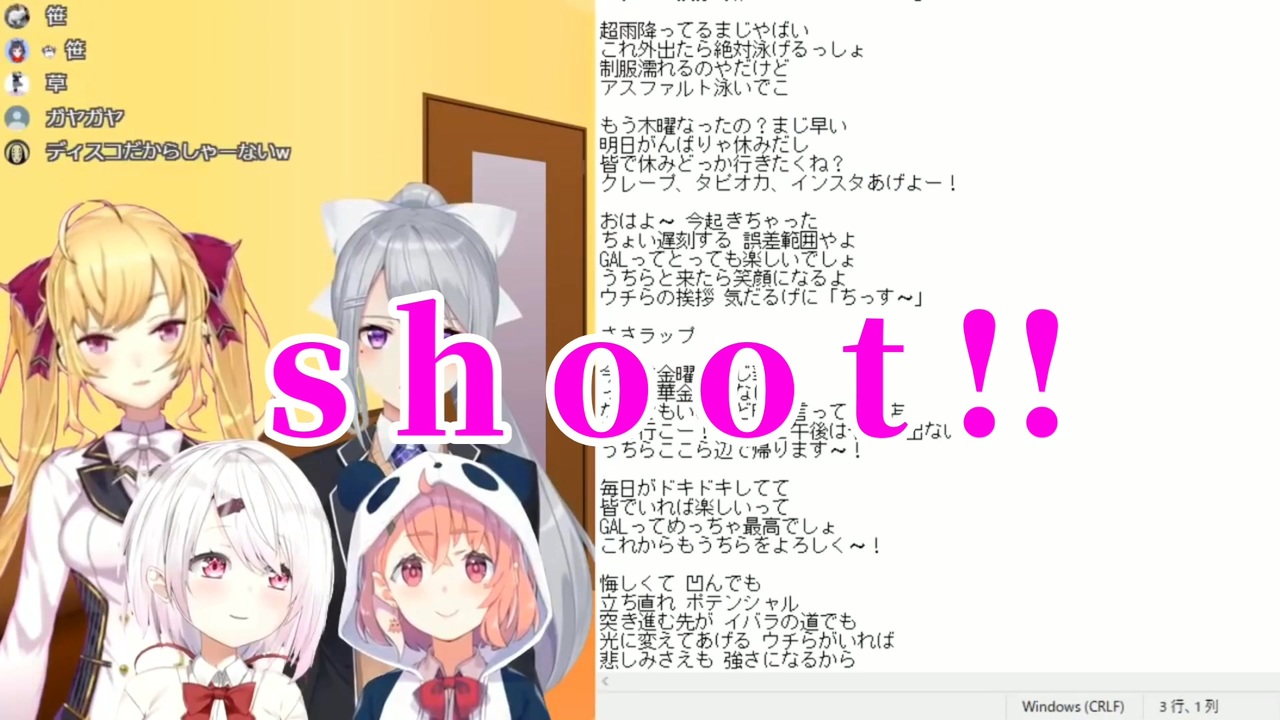 本編<br>【生配信】GALSでオリジナルソングの歌詞を考えよう!!!【にじさんじGALS】<br><a href="https://www.youtube.com/watch?v=LXb4ObiVNL8&t=2983s" target="_blank" rel="noopener nofollow">https://www.youtube.com/watch?v=LXb4ObiVNL8&t=2983s</a><br><br><br>椎名唯華<br>【youtube】<br><a href="https://www.youtube.com/channel/UC_4tXjqecqox5Uc05ncxpxg/videos?app=desktop" target="_blank" rel="noopener nofollow">https://www.youtube.com/channel/UC_4tXjqecqox5Uc05ncxpxg/videos?app=desktop</a><br>【twitter】<br><a href="https://twitter.com/yuika_siina?lang=ja" target="_blank" rel="noopener nofollow">https://twitter.com/yuika_siina?lang=ja</a><br><br>樋口楓<br>【youtube】<br><a href="https://www.youtube.com/channel/UCsg-YqdqQ-KFF0LNk23BY4A?app=desktop" target="_blank" rel="noopener nofollow">https://www.youtube.com/channel/UCsg-YqdqQ-KFF0LNk23BY4A?app=desktop</a><br>【twitter】<br><a href="https://twitter.com/higuchikaede?lang=ja" target="_blank" rel="noopener nofollow">https://twitter.com/higuchikaede?lang=ja</a><br><br>鷹宮リオン<br>【youtube】<br><a href="https://www.youtube.com/channel/UCV5ZZlLjk5MKGg3L0n0vbzw" target="_blank" rel="noopener nofollow">https://www.youtube.com/channel/UCV5ZZlLjk5MKGg3L0n0vbzw</a><br>【twitter】<br><a href="https://twitter.com/takamiyarion?lang=ja" target="_blank" rel="noopener nofollow">https://twitter.com/takamiyarion?lang=ja</a><br><br>笹木咲<br>【youtube】<br><a href="https://m.youtube.com/channel/UCoztvTULBYd3WmStqYeoHcA" target="_blank" rel="noopener nofollow">https://m.youtube.com/channel/UCoztvTULBYd3WmStqYeoHcA</a><br>【twitter】<br><a href="https://twitter.com/saku_sasaki?lang=ja" target="_blank" rel="noopener nofollow">https://twitter.com/saku_sasaki?lang=ja</a><br>