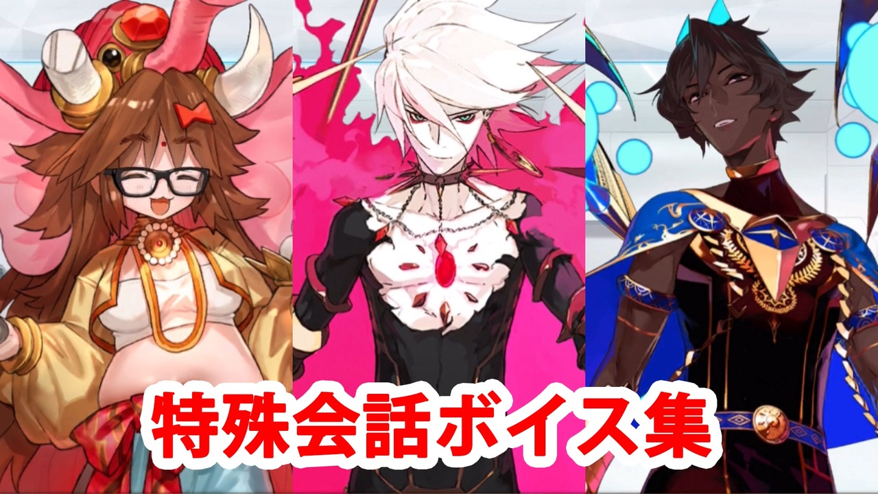 2019年6月2日~2019年7月3日の期間で実装された複数の特定サーヴァント所持時のマイルーム会話集です。<br>新規サーヴァントは2部4章が対象です。<br>対象キャラのアイコンの元はWiki情報なので対象キャラの抜け・間違いのある可能性もあります。<br><br>【対象サーヴァント】<br>不夜城のアサシン(武則天) / カルナ / アルジュナ / ラーマ / イシュタル(遠坂凛) <br>キングプロテア / カーマ(間桐桜) / 大いなる石像神(ジナコ=カリギリ) <br>ラクシュミー・バーイー / ウィリアム・テル / アルジュナ〔オルタ〕<br>アシュヴァッターマン / アスクレピオス<br><br>特殊会話ボイス集まとめ→<a href="https://www.nicovideo.jp/mylist/59802010" target="_blank" rel="noopener">mylist/59802010</a><br><br>YouTube版はこちら<br><a href="https://www.youtube.com/watch?v=-MjlJbj71Kc" target="_blank" rel="noopener nofollow">https://www.youtube.com/watch?v=-MjlJbj71Kc</a><br><br>投稿済ボイス集→<a href="https://www.nicovideo.jp/mylist/57873980" target="_blank" rel="noopener">mylist/57873980</a>
