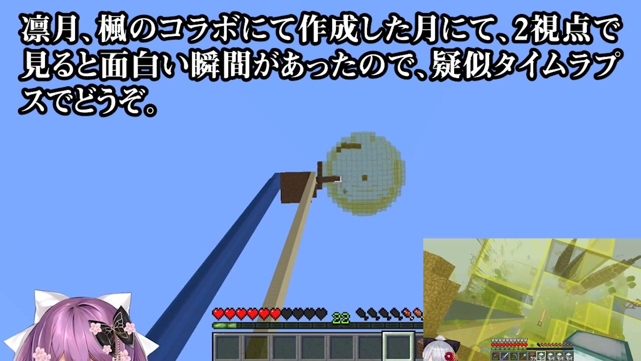 個人的に見たかったので。<br><br>見る角度によって表情を変える「月」を作成しようとした二人。<br>途中、2視点で見ると中々楽しい場面があったので擬似的なタイムラプスを作成しました。<br>本編も見どころが沢山ありますので是非見てみて!<br><br>※誤解があったので、大きな方が楓、小さな方が凛月視点です。両者コラボ相手の立ち絵を左に表示しているので誤解しやすいですが、間違ってないです。<br><br>マイリスト<br><a href="https://www.nicovideo.jp/mylist/66425655" target="_blank" rel="noopener">mylist/66425655</a><br><br>二人のチャンネル登録をよろしくだぜ!<br>桜凛月<br><a href="https://www.youtube.com/channel/UCfQVs_KuXeNAlGa3fb8rlnQ" target="_blank" rel="noopener nofollow">https://www.youtube.com/channel/UCfQVs_KuXeNAlGa3fb8rlnQ</a><br><br>樋口楓<br><a href="https://www.youtube.com/watch?v=RPz-p3mDbCc" target="_blank" rel="noopener nofollow">https://www.youtube.com/watch?v=RPz-p3mDbCc</a><br><br>使用動画<br>第2回でろンボ!!今回は 月作ってお月見だーー!!【にじさんじ】【Minecraft】<br><a href="https://www.youtube.com/watch?v=RPz-p3mDbCc" target="_blank" rel="noopener nofollow">https://www.youtube.com/watch?v=RPz-p3mDbCc</a><br><br>【でろクラ#41】中秋の名月作り!【でろンボ】<br><a href="https://www.youtube.com/watch?v=kCtpdMZ5w6k" target="_blank" rel="noopener nofollow">https://www.youtube.com/watch?v=kCtpdMZ5w6k</a><br><br>使用楽曲<br>float<br><a href="https://dova-s.jp/bgm/play11096.html" target="_blank" rel="noopener nofollow">https://dova-s.jp/bgm/play11096.html</a><br><br>youtube<br><a href="https://www.youtube.com/watch?v=_QJITwY8BR4" target="_blank" rel="noopener nofollow">https://www.youtube.com/watch?v=_QJITwY8BR4</a>