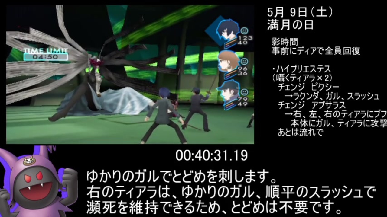 僕の動画にも、まだまだロスの行動があります。<br>気づいた人は、追走などいかがでしょうか。<br><br>前 <a href="https://www.nicovideo.jp/watch/sm35674356" class="watch">sm35674356</a><br>次 <a href="https://www.nicovideo.jp/watch/sm35805050" class="watch">sm35805050</a><br><span style="color: #000000; font-size: 13px;">P3Pキタロー編マイリスト <a href="https://www.nicovideo.jp/mylist/66723745" target="_blank" rel="noopener">mylist/66723745</a></span><br><br><br /><span style="font-size: 14px;">ただいま、全ボスRTAのチャートを検討中<br><br>あと、ブロマガに攻略方法をか書いてます</span><br><a href="https://ch.nicovideo.jp/tick_show/blomaga/ar1771958" target="_blank" rel="noopener nofollow">https://ch.nicovideo.jp/tick_show/blomaga/ar1771958</a><br><br><br><span style="color: #000000; font-size: 14px;">twitter </span><a href="https://twitter.com/tick_show_RTA" target="_blank" rel="noopener nofollow">https://twitter.com/tick_show_RTA</a>