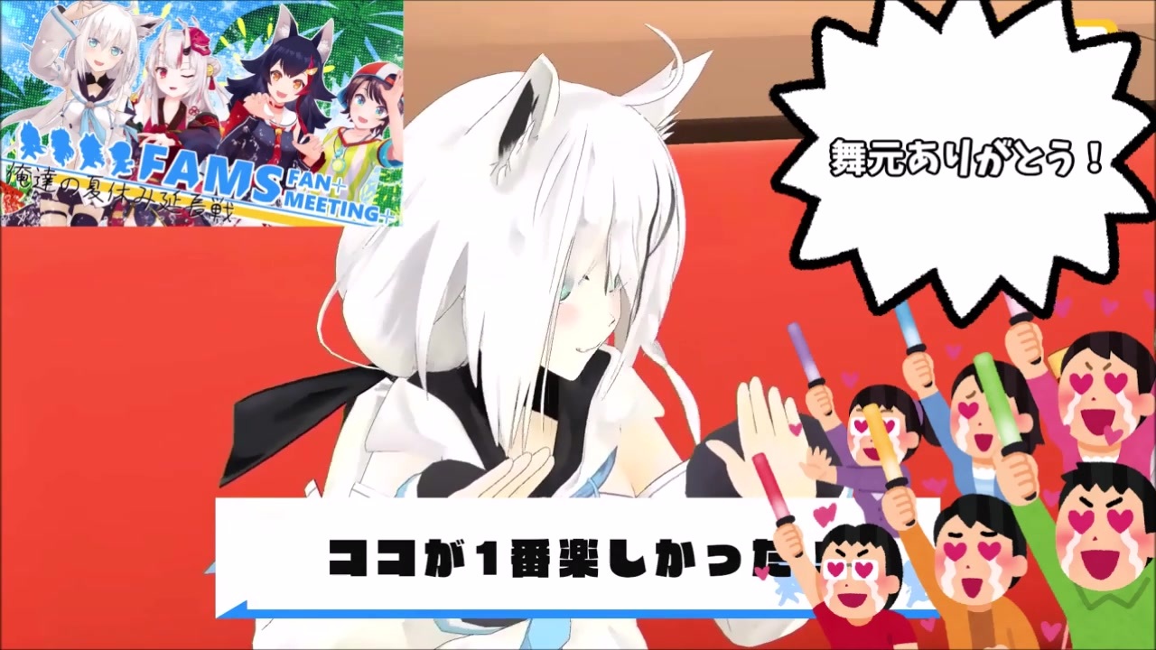 元動画:<span style="font-size: 16px;"><strong>【延長戦の延長戦】FAMSイベントアフタートーク!【 </strong></span><strong>#ファムズミ</strong><span style="font-size: 16px;"><strong> 】</strong></span><br><a href="https://www.youtube.com/watch?v=1l-414MOr2k" target="_blank" rel="noopener nofollow">https://www.youtube.com/watch?v=1l-414MOr2k</a><br><br><br><strong>白上フブキ(✞白狐のFUBUKI✞)</strong><br>Youtube:<a href="https://www.youtube.com/channel/UCdn5BQ06XqgXoAxIhbqw5Rg" target="_blank" rel="noopener nofollow">https://www.youtube.com/channel/UCdn5BQ06XqgXoAxIhbqw5Rg</a><br>Twitter:<a href="https://twitter.com/shirakamifubuki" target="_blank" rel="noopener nofollow">https://twitter.com/shirakamifubuki</a><br><br><strong>百鬼あやめ(鬼神□百鬼)</strong><br>Youtube:<a href="https://www.youtube.com/channel/UC7fk0CB07ly8oSl0aqKkqFg" target="_blank" rel="noopener nofollow">https://www.youtube.com/channel/UC7fk0CB07ly8oSl0aqKkqFg</a><br>Twitter:<a href="https://twitter.com/nakiriayame" target="_blank" rel="noopener nofollow">https://twitter.com/nakiriayame</a><br><br><strong>大神ミオ(黒神 臣) </strong><br>Youtube:<a href="https://www.youtube.com/channel/UCp-5t9SrOQwXMU7iIjQfARg" target="_blank" rel="noopener nofollow">https://www.youtube.com/channel/UCp-5t9SrOQwXMU7iIjQfARg</a><br>Twitter:<a href="https://twitter.com/ookamimio" target="_blank" rel="noopener nofollow">https://twitter.com/ookamimio</a><br><br><strong>大空スバル(スバ谷スバ夫)</strong><br>Youtube:<a href="https://www.youtube.com/channel/UCvzGlP9oQwU--Y0r9id_jnA" target="_blank" rel="noopener nofollow">https://www.youtube.com/channel/UCvzGlP9oQwU--Y0r9id_jnA</a><br>Twitter:<a href="https://twitter.com/oozorasubaru" target="_blank" rel="noopener nofollow">https://twitter.com/oozorasubaru</a><br><br><br><strong>舞元啓介(サキュバス舞元)</strong><br>Youtube:<a href="https://www.youtube.com/channel/UCJubINhCcFXlsBwnHp0wl_g" target="_blank" rel="noopener nofollow">https://www.youtube.com/channel/UCJubINhCcFXlsBwnHp0wl_g</a><br>Twitter:<a href="https://twitter.com/maimoto_k" target="_blank" rel="noopener nofollow">https://twitter.com/maimoto_k</a>