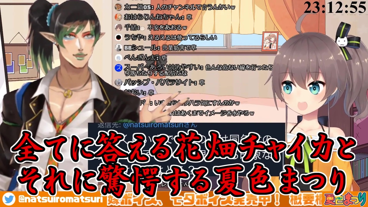 さすがのまつりちゃんも戦慄しておる<br>チャイチャイにブレーキは存在しないのだ<br><br>本家参考動画<br><a href="https://youtu.be/cc7Ke6EcdI4" target="_blank" rel="noopener nofollow">https://youtu.be/cc7Ke6EcdI4</a><br><br>参考チャンネル<br>・夏色まつり<br><a href="https://www.youtube.com/channel/UCQ0UDLQCjY0rmuxCDE38FGg" target="_blank" rel="noopener nofollow">https://www.youtube.com/channel/UCQ0UDLQCjY0rmuxCDE38FGg</a><br>・花畑チャイカ<br><a href="https://www.youtube.com/channel/UCsFn_ueskBkMCEyzCEqAOvg" target="_blank" rel="noopener nofollow">https://www.youtube.com/channel/UCsFn_ueskBkMCEyzCEqAOvg</a><br><br>参考元主Twitter<br>・夏色まつり<br><a href="https://twitter.com/natsuiromatsuri" target="_blank" rel="noopener nofollow">https://twitter.com/natsuiromatsuri</a><br>・花畑チャイカ<br><a href="https://twitter.com/ZulmIhP1nlMOT5y" target="_blank" rel="noopener nofollow">https://twitter.com/ZulmIhP1nlMOT5y</a><br><br>ニコニコのダイコンマンリスト<br>「バーチャルYouTuberシリーズ」↓<br><a href="https://www.nicovideo.jp/mylist/62551838" target="_blank" rel="noopener">mylist/62551838</a><br><br>YouTubeのダイコンマンチャンネル<br><a href="https://www.youtube.com/channel/UCkpfR11cG2kk9KTJijWCJfg" target="_blank" rel="noopener nofollow">https://www.youtube.com/channel/UCkpfR11cG2kk9KTJijWCJfg</a>