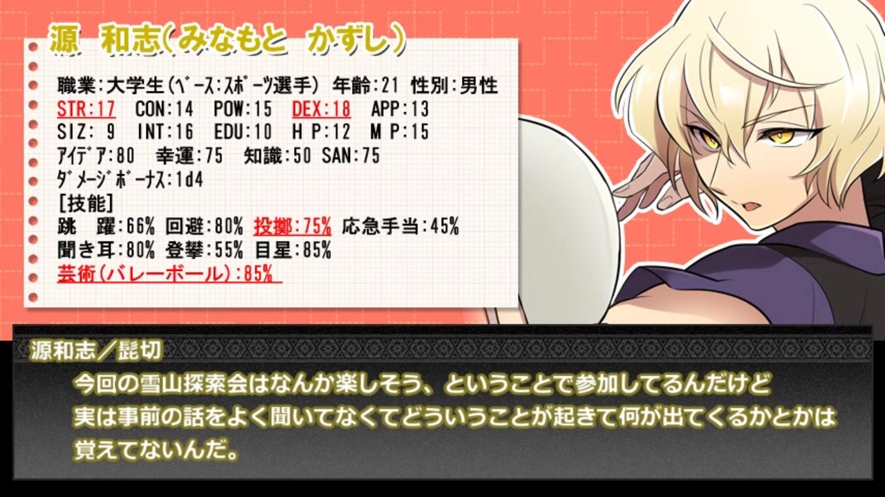 <span style="color: #ff0000;">※シナリオ「雪山密室」のネタバレをします(そりゃあな)。<br>※シナリオ「水没列車」の話題にネタバレしない程度に触れています。</span><br><br>(プレイヤーサイズ(大)での視聴がちょうどいいサイズです…。)<br><br>KP初心者とPL初心者とTRPG動画初心者による何が起きるかよくわからない「雪山密室」をお届けします!<br>あまりにも初心者すぎて何もかもよくわからない、まあ、茶でも飲みながら気楽に行きましょう。<br>(9/18追記)<br>ほんまや!! 兼さんの初期SAN値☓53→○55です。うぷ主うっかり野郎なので今後もやらかすことでしょう。<br><br><span style="color: #000000; font-size: 14px;">【 次 </span><a href="https://www.nicovideo.jp/watch/sm35811245" class="watch">sm35811245</a><span style="color: #000000; font-size: 14px;"> 】 マイリスト( </span><a href="https://www.nicovideo.jp/mylist/66671991" target="_blank" rel="noopener">mylist/66671991</a><span style="color: #333333; font-size: 16px;"><strong> </strong></span><span style="color: #000000; font-size: 14px;">)</span><br><br>------------------------------------------------------------<br>鶴 丸 笑い上戸のうっかり野郎<br>一 期 気遣いのできるマイペース<br>薬 研 ツッコミの距離が遠い<br>和泉守 擬音がやたら多い<br>髭 切 ボケか素かよくわからん