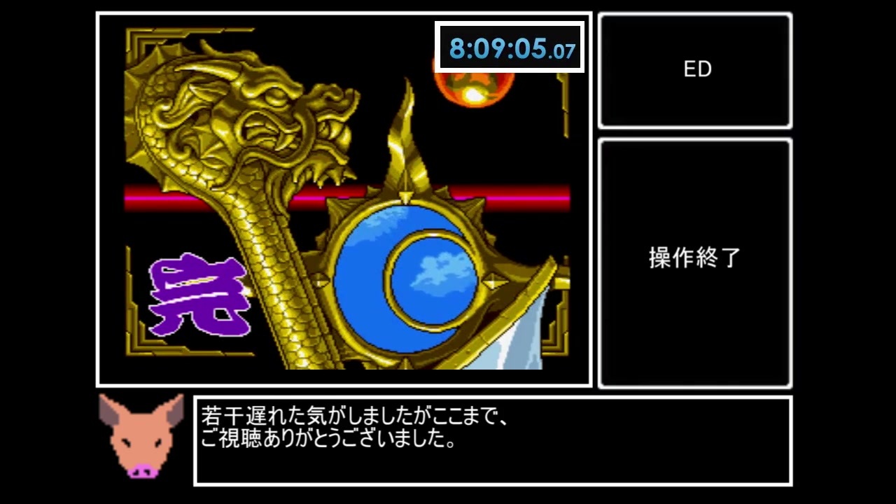 編集も操作もチャートもガバガバでしたが、これで完結です。<br>深夜に通しで作って耳がおかしくなっているせいか、<br>音がズレているのかだけはわかりませんでした。<br>許してください何でもしますから<br><br>ニニギ撃破~ED<br>前:<a href="https://www.nicovideo.jp/watch/sm35694771" class="watch">sm35694771</a><br>パート1:<a href="https://www.nicovideo.jp/watch/sm35550878" class="watch">sm35550878</a><br /><br>天外魔境ZEROバグ無しRTA_8時間9分5秒07<br><br>計測区間<br>計測開始:誕生日入力後「はい」を選択した所から<br>計測終了:エンディングで「完」の文字が表示された所まで<br><br>マイリスト:<a href="https://www.nicovideo.jp/my/mylist/#/66285003" target="_blank" rel="noopener nofollow">https://www.nicovideo.jp/my/mylist/#/66285003</a><br>無編集版マイリスト:<a href="https://www.nicovideo.jp/my/mylist/#/66277017+sort=7" target="_blank" rel="noopener nofollow">https://www.nicovideo.jp/my/mylist/#/66277017+sort=7</a><br><br>参考にした攻略サイト様:<a href="http://tengaimakyouzero.g2.xrea.com/tengaizero.html" target="_blank" rel="noopener nofollow">http://tengaimakyouzero.g2.xrea.com/tengaizero.html</a><br><br>チャートの参考元:<br><a href="https://ch.nicovideo.jp/kz2525/blomaga/ar1022316" target="_blank" rel="noopener nofollow">https://ch.nicovideo.jp/kz2525/blomaga/ar1022316</a><br><a href="https://ch.nicovideo.jp/yamihune/blomaga/ar1191290" target="_blank" rel="noopener nofollow">https://ch.nicovideo.jp/yamihune/blomaga/ar1191290</a>