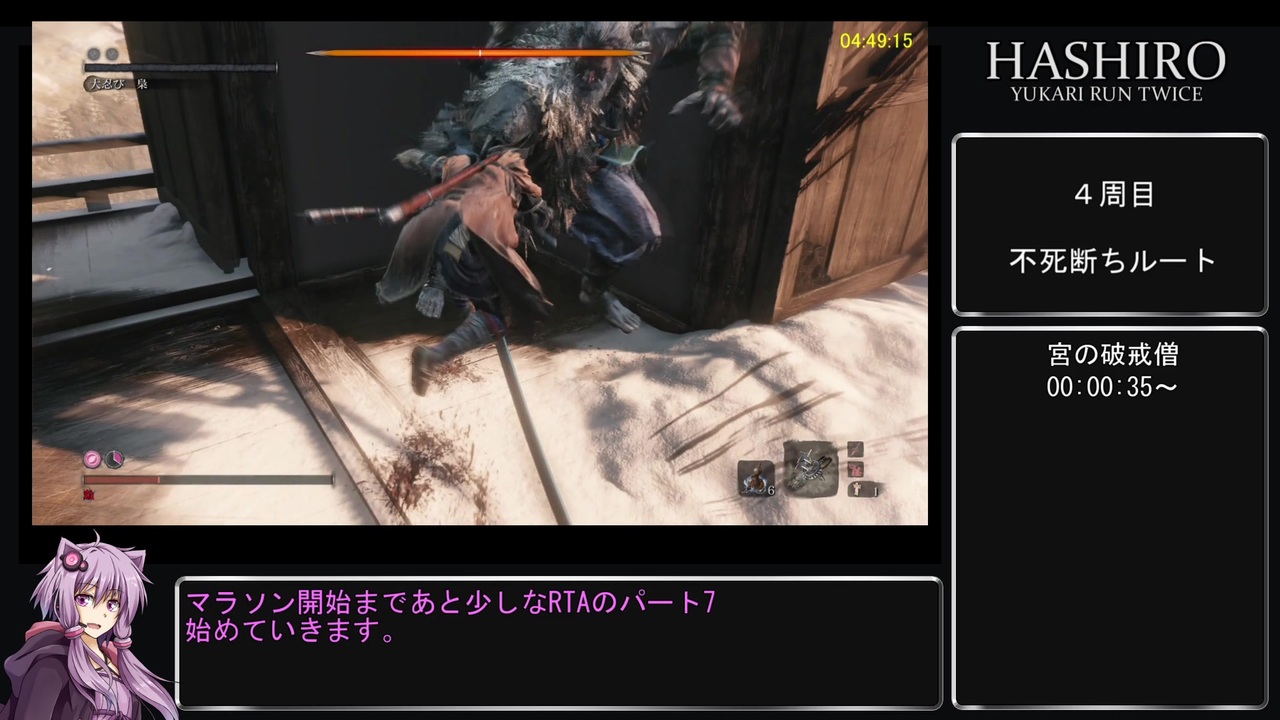 本動画は『SEKIRO - SHADOWS DIE TWICE -』のトロコンRTAとなります。<br><br>前回までの動画を視聴・コメント・マイリストしてくださった方ありがとうございます。<br>今回のマラソンコースは残念ながら最速ではありません。<br>ですが、まだ速くなれる余地があるというのは嬉しい事です。<br>ちなみに今回設定していた目標は6時間30分、ガバ可能猶予時間は30分以上と激甘です。<br><br><span style="font-size: 13px;"><レギュレーション></span><br>・PS4版 Ver1.04<br>・タイムはIGT(目安として右上にタイマー設置)<br>・バグなし<br>・バックアップ禁止<br>・意図的なゲーム強制終了の禁止<br><br>前回:<a href="https://www.nicovideo.jp/watch/sm35692168" class="watch">sm35692168</a><br>次回:-<br>マイリスト:<a href="https://www.nicovideo.jp/mylist/66291082" target="_blank" rel="noopener">mylist/66291082</a><br><br><span style="color: #000000; font-size: 18px;">10/29 追記:また走ったらしいっすよ。</span><br><br><span style="font-size: 13px;">広告者様ご紹介</span><br>キク様 脂煙様 Ruinmaker様 0507_hajime様 ncr様 nicol様<br>rin様 まれい様 hoge様 八ク寺P様 etc.様 アンテナDX様<br>minazki様 子蓉様 Takanory様 JACK様 Strong様 もちねこ様<br>Null様 伊達めがね様 ナイフの人様 本と並行世界の旅人様<br>ノーム様 蒼猫(=^・ω・^=)様 カツ様 smoochy様 るりるり様<br>鍋焼きうどん様 えぶりす様 なべ様<br><span style="font-size: 13px;">多くのご広告、本当にありがとうございます。</span><br /><br>パート1集:<a href="https://www.nicovideo.jp/mylist/65985766" target="_blank" rel="noopener">mylist/65985766</a><br>Twitter(主に投稿連絡用):<a href="https://twitter.com/fSeasons78" target="_blank" rel="noopener nofollow">https://twitter.com/fSeasons78</a>