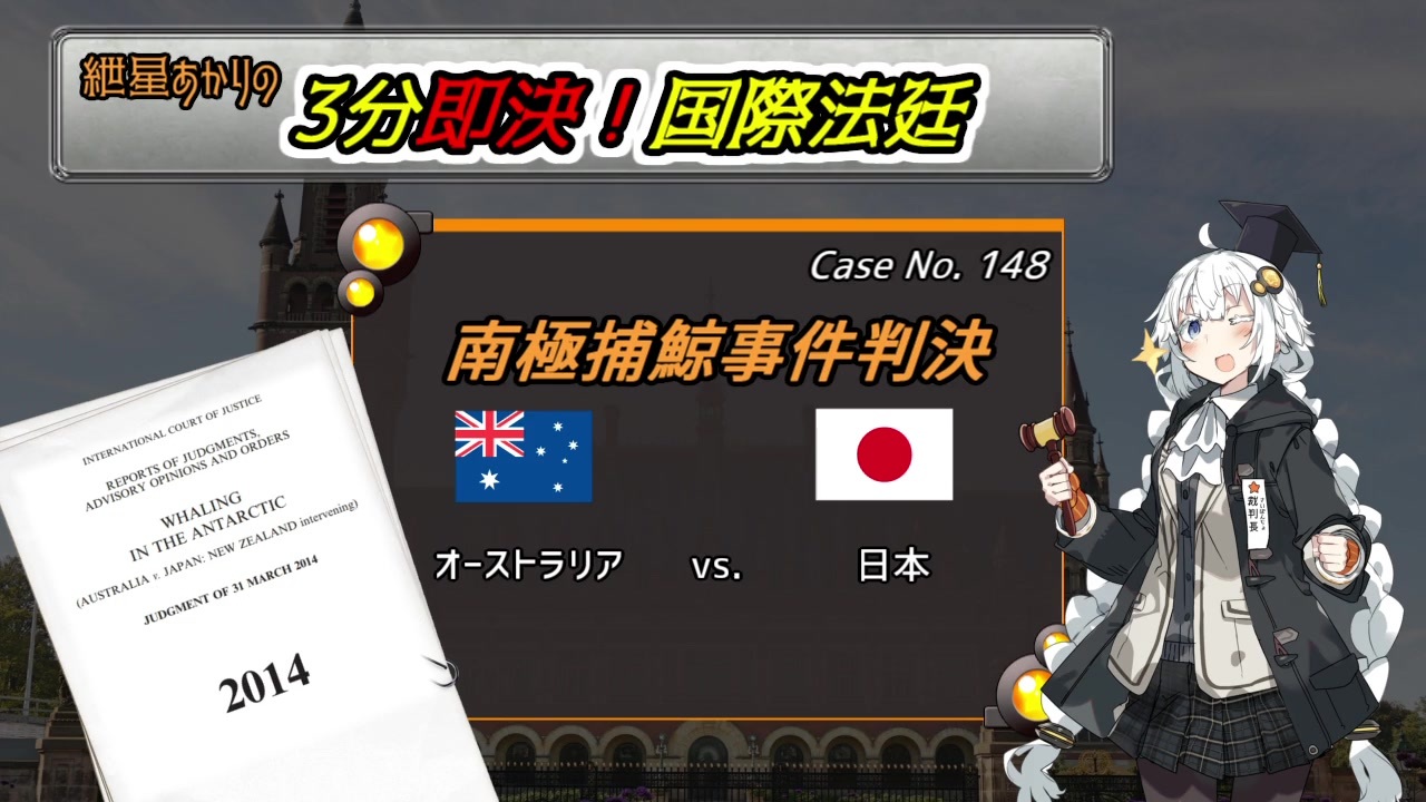 <strong>裁判所標準時ではまだ8月()</strong><br> <br>「何やってんだよ?水産庁!」<br>「何だよ、結構鯨肉うめぇじゃねぇか…」<br>「す、水産庁…」<br>『おたくの水産庁がこんなこと言ってますけど』<br>「あっ…あぁ…」<br>「なんて声出してやがる…弁護団」<br>「だって…だって…(負けそう)」<br>「俺は水産庁長官だぞ。こんくれぇなんてこたぁねぇ。」<br>「そんな…鯨肉なんかのために!」<br>「供給と雇用を守んのは俺の仕事だ」<br>「でも!」<br>「いいから捕鯨に行くぞ。鯨が待ってんだ。<span style="color: #111111;">俺は捕鯨止めねぇからよ、俺らが止まんねぇかぎり、<br> その先に需要はできる!だからよ、止めるんじゃねぇぞ・・・。」</span><br><br>You Lose!<br><br><span style="font-size: 13px;">※条約文等をじっくり読みたい方は一時停止推奨</span><br><br>ーーーー<br><strong>前回</strong>「前編(管轄権)」→【<a href="https://www.nicovideo.jp/watch/sm35517725" class="watch">sm35517725</a>】<br><br>3分 ⇒<span style="color: #006699; font-size: 14px;"><a href="https://www.nicovideo.jp/mylist/66005874" target="_blank" rel="noopener">mylist/66005874</a></span><br>番外⇒<a href="https://www.nicovideo.jp/mylist/66236763" target="_blank" rel="noopener">mylist/66236763</a>