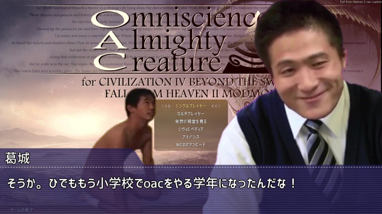 近所の小学生にお金を渡してプレイしてもらいました。<br><br>【ゲームタイトル】Civilization Ⅳ Beyond the Sword<br>【mod】Fall from Heaven Ⅱ<br>【modmod】Omniscience Almighty Creature<br><br>【設定】<br>文明:リネージ<br><span style="color: #000000; font-size: 13px;">助っ人の永久同盟国:残り火一族(強力な3英雄と建造物付きの首都を保有)</span><br>難易度:皇帝(50ターン毎に難易度1つ上昇。100ターン目以降は天帝固定)<br>開始時の文明数:10<br>地図:Terra<br>大きさ:小さい<br>気候:温暖<br>海面:低い<br>速度:普通<br>世界観:円筒形(両端で接続)<br><br>・このシリーズはなるべく少ない編集・語録量、糞クオリティでサクッと終わらせる所存です。よろしくお願いいたします。<br>・魅せプレイ動画ではないのでそういうのが観たい方はこんな動画観なくていいから(良心)<br>・あと必ず失踪します。<br><br>作った動画→ <a href="https://www.nicovideo.jp/mylist/54804000" target="_blank" rel="noopener">mylist/54804000</a><br><br>次話→ <a href="https://www.nicovideo.jp/watch/sm35737079" class="watch">sm35737079</a>