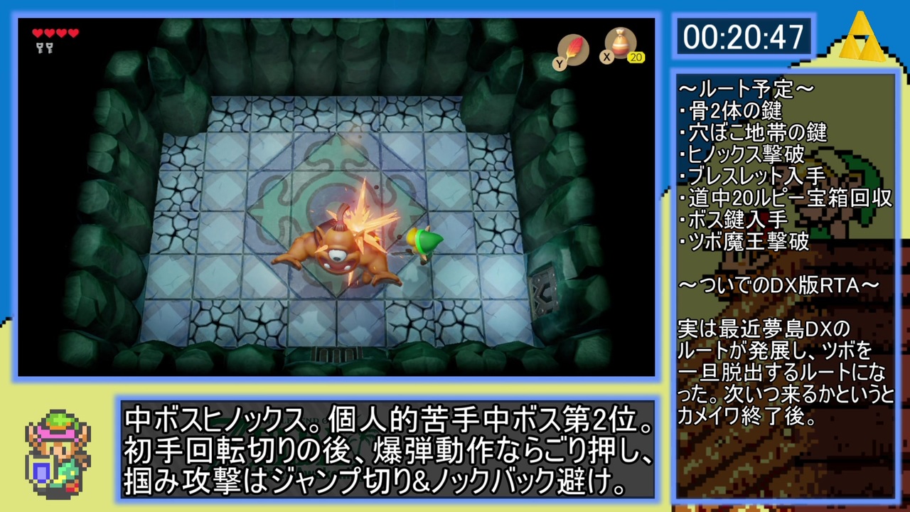 早速夢島リメイクに革命が起こりかけているので急遽初投稿です。<br>ネタは詰めていません。純粋なRTA動画としてお楽しみください。<br><br>夢をみる島リメイク発売おめでとうございます。記念にルート仕上げて速攻RTAしました。<br>ルールはまだ制定されていないのでAny%と書いておきます。決まり次第編集します。<br><br>~計測範囲~<br>スタート:名前を決めて「OK」を押した瞬間<br>ストップ:ラスボス戦で出現する階段を上った後のロード(ブラックアウト)<br><br><span style="color: #000000; font-size: 13px;">※動画内では触れていませんが、参考資料としてDX版の夢島RTA(NoOoB/WW)も流しています。</span><br><br>Lv.1→<a href="https://www.nicovideo.jp/watch/sm35710172" class="watch">sm35710172</a><br>Lv.3→<a href="https://www.nicovideo.jp/watch/sm35718784" class="watch">sm35718784</a><br><span style="color: #000000; font-size: 14px;">マイリスト→</span><span style="font-size: 14px;"><a href="https://www.nicovideo.jp/mylist/66662024" target="_blank" rel="noopener">mylist/66662024</a></span><br>シリーズ→<a href="https://www.nicovideo.jp/series/62099" target="_blank" rel="noopener">series/62099</a><br>無編集版(youtube)→<a href="https://www.youtube.com/watch?v=JseTgSbzw98&t=37s" target="_blank" rel="noopener nofollow">https://www.youtube.com/watch?v=JseTgSbzw98&t=37s</a><br><br>こうした方がいいかも、これできるよというコメントは大歓迎です。どんどん更新箇所指摘ください。<br><span style="color: #000000; font-size: 14px;">※luaをいじったせいで右上のタイマーがバグっていました。次回から直します。</span>