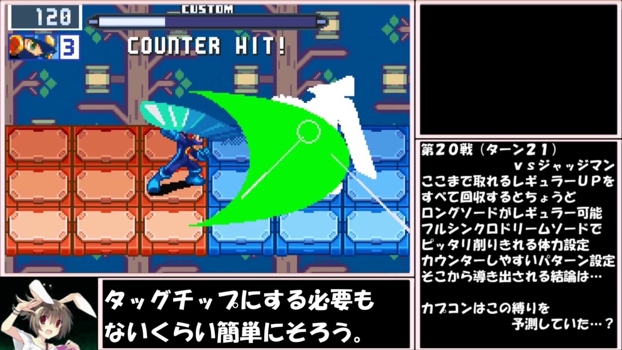 第4話 「異議あり!法廷バトル」 前回が長すぎただけで、これぐらいが普通の長さなんだよ、きっと。<br>プログラムアドバンス、強いことは強いけど、チップ1枚当たりのダメージ効率は大してよろしくはない。<br>今回の制限は最少勝利回数+チップのみ使用でチップのリロードほぼ無し。詳細はマイリストにあります。<br><br>ロックマンエグゼ6グレイガ <a href="https://www.nicovideo.jp/mylist/65259031" target="_blank" rel="noopener">mylist/65259031</a><br>ロックマンエグゼ6ファルザー(本シリーズ)<a href="https://www.nicovideo.jp/mylist/65259061" target="_blank" rel="noopener">mylist/65259061</a><br>他投稿動画のPart1まとめ <a href="https://www.nicovideo.jp/mylist/54759285" target="_blank" rel="noopener">mylist/54759285</a><br><br>通常版 第3話 <a href="https://www.nicovideo.jp/watch/sm35568223" class="watch">sm35568223</a> 第5話 <a href="https://www.nicovideo.jp/watch/sm35944926" class="watch">sm35944926</a><br>微編集版 第4話 <a href="https://www.nicovideo.jp/watch/sm35760126" class="watch">sm35760126</a><br><br>ついったー(編集の進捗とかカードゲームとかその他もろもろ)<br><a href="https://twitter.com/J_NEX_PA" target="_blank" rel="noopener nofollow">https://twitter.com/J_NEX_PA</a>