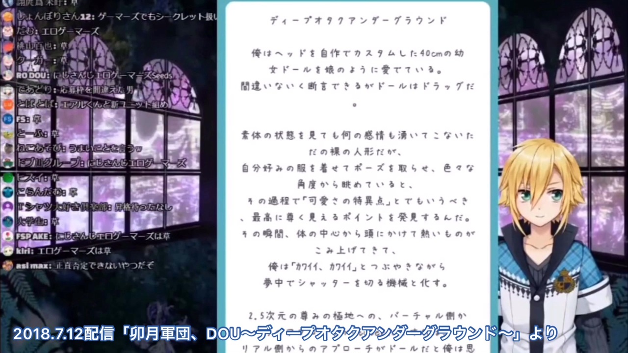 卯月コウ切り抜き動画界のトップランナーこと「【闇】男性Vtuber達の現実【真実】」( <a href="https://www.nicovideo.jp/watch/sm34764459" class="watch">sm34764459</a> )を見ていて「俺の夢はいつか冥王星に行ってパトラちゃん聞くことなんだ」というコウの発言にピンと来てないリスナーが多いような気がしたので、オーディオ厨コピペについての解説動画を作ろうと思ったのですが、配信で一般層に伝わりにくいネタを使って、まるで妄言を言い続けてるようにも見える卯月コウサイドにも問題があると思ったので、卯月コウがオーディオ厨コピペについて語ってるところを雑に切り抜くことにしました。ほぼほぼノー編集な切り抜き動画ですが、ここは一つ喧嘩両成敗ということで水に流してはくれないでしょうか。<br><br>前回あげた切り抜き動画(ロックバンドで陰キャ陽キャ仕分けを行う卯月コウ <a href="https://www.nicovideo.jp/watch/sm35661566" class="watch">sm35661566</a> )が結構再生されてて、そのうえ古参の有名ゲーム実況者さんがたまたまその切り抜き動画を観た感想を配信で話したらしく、クロノワまで巻き込むプチ騒動になってしまったのは、正直自分でもひいてます。<br>自分的には邦ロックネタはニッチなところ攻めたと思ってたので、あんなに拡散されると思ってなかったです。今後はさらにコアでニッチでバズりようがない卯月コウ切り抜きを細々と続けていきたいと思いますので、よろしくお願いします。<br>ところでTHE BLUE HEARTSのTRAIN-TRAINの歌詞ってめちゃくちゃ深いですよね。「弱い者達が夕暮れ さらに弱い者を叩く」なんて、まさにSNS時代の現代にも通じる歌詞じゃないですか?「見えない自由が欲しくて見えない銃を撃ちまくる」ってのも主義主張が異なる相手への匿名での言葉の暴力を表してるように聞こえてきますよね。そこで「本当の声を聞かせておくれよ」ですから。しかも「見えない自由」と「見えない銃」で完全に子音踏みしてるんですよ。ラッパーにブルーハーツファンが多いのも頷ける。とにかく令和にも語り継ぐべき名曲。<br><br><span style="font-size: 18px;">本編(2018/7/12配信)↓<br>卯月軍団、DOU~ディープオタクアンダーグラウンド~ <a href="https://youtu.be/yyMCuQp6kGI" target="_blank" rel="noopener nofollow">https://youtu.be/yyMCuQp6kGI</a></span>