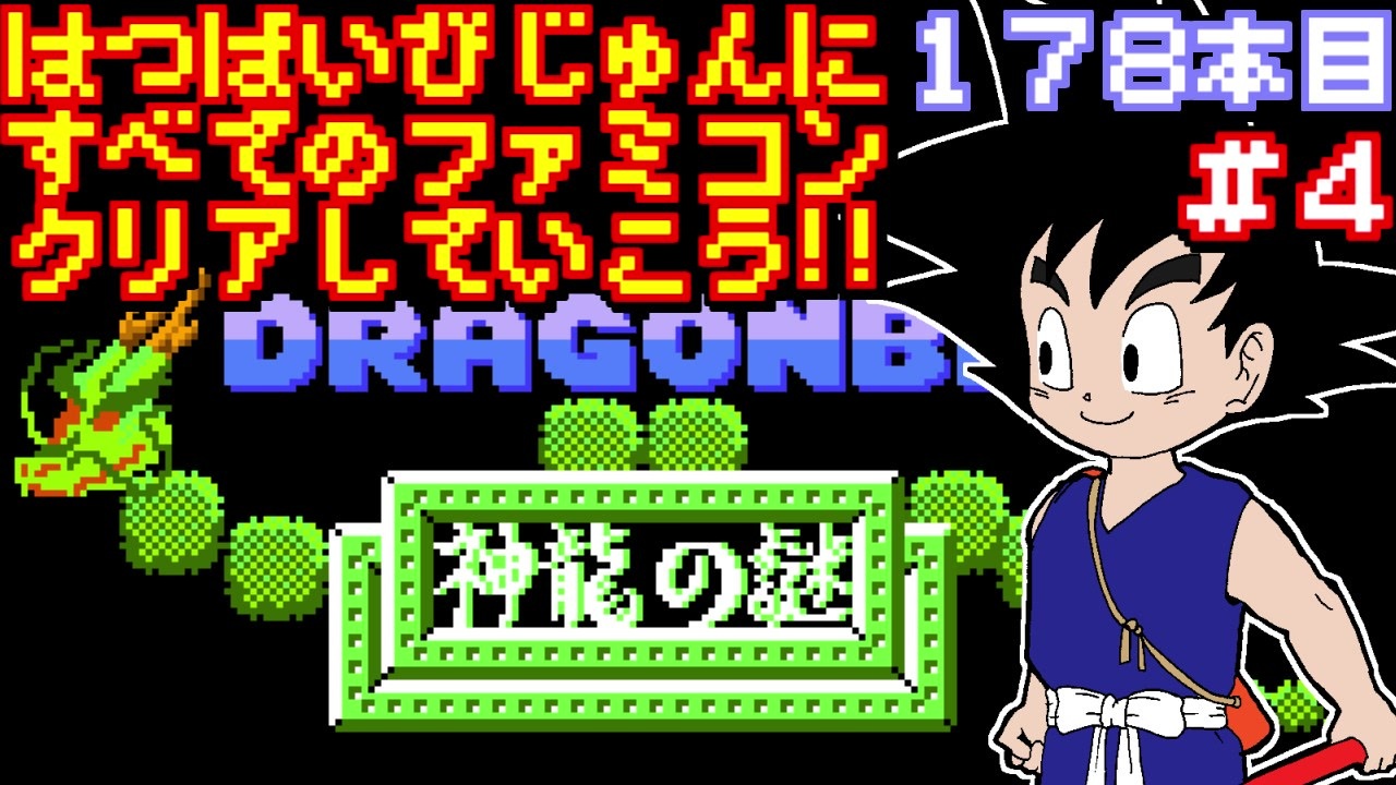 178本目 ドラゴンボール 神龍の謎 クリア条件:コンペイ塔をクリアしEDを見る<br><br><span style="color: #ff0000; font-size: medium;">発売日順に全てのファミコンソフトをクリアしていこう、という企画です。</span><br><br>1986年11月27日<br>バンダイ<br>アクション<br>ドラゴンボール 神龍の謎<br><span style="color: #ffffff;">検索用:ファミリーコンピュータ NES 実況プレイ動画 レトロゲーム シェンロンの謎 謎シリーズ</span><br>■前回→<a href="https://www.nicovideo.jp/watch/sm35621735" class="watch">sm35621735</a><br>■次回→<a href="https://www.nicovideo.jp/watch/sm35704557" class="watch">sm35704557</a><br><br>■サムネのイラストはひでごんすさん→<a href="https://www.nicovideo.jp/user/3237582" target="_blank" rel="noopener">user/3237582</a><br /><br>◇◆じゅんくりマイリスト関連◆◇<br>■全じゅんくりマイリスト1→<a href="https://www.nicovideo.jp/mylist/67057947" target="_blank" rel="noopener">mylist/67057947</a><br>■全じゅんくりマイリスト2→<a href="https://www.nicovideo.jp/mylist/67057957" target="_blank" rel="noopener">mylist/67057957</a><br>■全じゅんくりマイリスト3→<a href="https://www.nicovideo.jp/mylist/72945068" target="_blank" rel="noopener">mylist/72945068</a><br>■じゅんくりpart1集→<a href="https://www.nicovideo.jp/mylist/67169410" target="_blank" rel="noopener">mylist/67169410</a><br>■1983年→<a href="https://www.nicovideo.jp/mylist/50525072" target="_blank" rel="noopener">mylist/50525072</a><br>■1984年→<a href="https://www.nicovideo.jp/mylist/50525168" target="_blank" rel="noopener">mylist/50525168</a><br>■1985年→<a href="https://www.nicovideo.jp/mylist/50525247" target="_blank" rel="noopener">mylist/50525247</a><br>■1986年→<a href="https://www.nicovideo.jp/mylist/50525642" target="_blank" rel="noopener">mylist/50525642</a><br>■1987年→<a href="https://www.nicovideo.jp/mylist/72895831" target="_blank" rel="noopener">mylist/72895831</a><br>■ディスクシステム→<a href="https://www.nicovideo.jp/mylist/50525822" target="_blank" rel="noopener">mylist/50525822</a><br>■番外編マイリスト→<a href="https://www.nicovideo.jp/mylist/67689092" target="_blank" rel="noopener">mylist/67689092</a><br><br>◇その他にーや。関連◇<br>■にーや。が語るだけ→<a href="https://www.nicovideo.jp/mylist/67575298" target="_blank" rel="noopener">mylist/67575298</a><br>■ファミコンカタログ→<a href="https://www.nicovideo.jp/mylist/67359834" target="_blank" rel="noopener">mylist/67359834</a><br>■YouTubeチャンネル→<a href="https://www.youtube.com/user/218niya0707" target="_blank" rel="noopener nofollow">https://www.youtube.com/user/218niya0707</a><br>■Twitter→<a href="https://twitter.com/famicom_ni_ya" target="_blank" rel="noopener nofollow">https://twitter.com/famicom_ni_ya</a><br>■企画詳細→ <a href="http://niya28.web.fc2.com/fc/gamelist.html" target="_blank" rel="noopener nofollow">http://niya28.web.fc2.com/fc/gamelist.html</a>