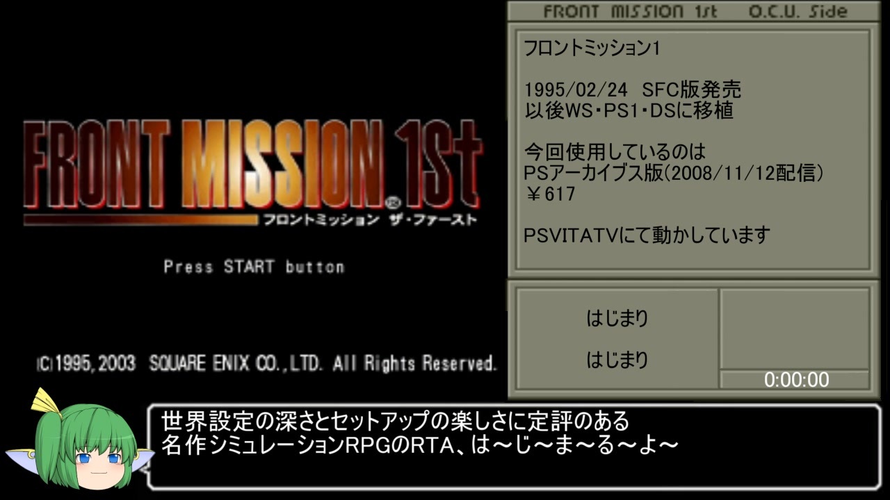 長期投稿(予定)の動画は初投稿です<br>軍オタではないので要素はありません<br><br>スタート~MISSION3直前まで<br><br>計測開始:タイトル画面でスタートボタン押下時<br>計測終了:エンディング終了後、「THE END」の文字が表示された瞬間<br><br>使用機種:PSアーカイブス版<br>使用ハード:PSVITATV<br><br>参考動画:実質先駆者様<a href="https://www.nicovideo.jp/watch/sm23895633" class="watch">sm23895633</a> 田巣さん<a href="https://www.nicovideo.jp/watch/sm26134443" class="watch">sm26134443</a><br>参考文献:tenmou.netとミリタリーガイド、あとうぃき<br><br><br><span style="font-size: 18px;">次→<a href="https://www.nicovideo.jp/watch/sm35774962" class="watch">sm35774962</a></span><br><br>マイリスト<br><a href="https://www.nicovideo.jp/mylist/66628757" target="_blank" rel="noopener">mylist/66628757</a><br><br>投稿動画Part1集<br><a href="https://www.nicovideo.jp/mylist/58180228" target="_blank" rel="noopener">mylist/58180228</a><br><br>PNB兄貴、y.y兄貴、けいきゅー兄貴、他総勢232名(義)の兄貴達、宣伝アリシャス!