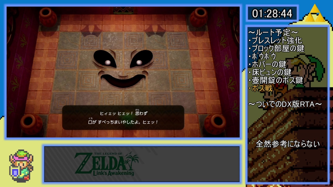 休み前に作っちゃったので初投稿です。<br>ネタは詰めていません。純粋なRTA動画としてお楽しみください。<br><br>夢をみる島リメイク発売おめでとうございます。記念にルート仕上げて速攻RTAしました。<br>ルールはまだ制定されていないのでAny%と書いておきます。決まり次第編集します。<br><br>~計測範囲~<br>スタート:名前を決めて「OK」を押した瞬間<br>ストップ:ラスボス戦で出現する階段を上った後のロード(ブラックアウト)<br><br><span style="color: #000000; font-size: 13px;">※動画内では触れていませんが、参考資料としてDX版の夢島RTA(NoOoB/WW)も流しています。</span><br><br>Lv.5→<a href="https://www.nicovideo.jp/watch/sm35762358" class="watch">sm35762358</a><br>Lv.7→<a href="https://www.nicovideo.jp/watch/sm35809051" class="watch">sm35809051</a><br><span style="color: #000000; font-size: 14px;">マイリスト(new!)→</span><span style="font-size: 14px;"><a href="https://www.nicovideo.jp/mylist/66662024" target="_blank" rel="noopener">mylist/66662024</a></span><br>シリーズ→<a href="https://www.nicovideo.jp/series/62099" target="_blank" rel="noopener">series/62099</a><br>無編集版(youtube)→<a href="https://www.youtube.com/watch?v=JseTgSbzw98&t=37s" target="_blank" rel="noopener nofollow">https://www.youtube.com/watch?v=JseTgSbzw98&t=37s</a><br><br>こうした方がいいかも、これできるよというコメントは大歓迎です。どんどん更新箇所指摘ください。<br>※ほえーアクセサリーは海外版からなんすね、知らんかった