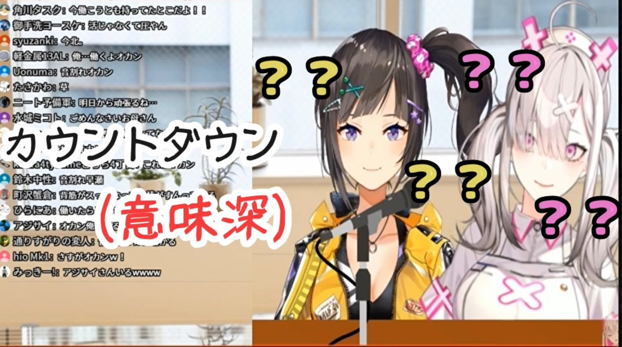 カウントダウン(意味深)<br><br>元配信はこちらです→ <a href="https://www.youtube.com/watch?v=ejC7MLQzpb4" target="_blank" rel="noopener nofollow">https://www.youtube.com/watch?v=ejC7MLQzpb4</a><br><br>健屋花那 公式チャンネル<br><a href="https://www.youtube.com/channel/UC8C1LLhBhf_E2IBPLSDJXlQ" target="_blank" rel="noopener nofollow">https://www.youtube.com/channel/UC8C1LLhBhf_E2IBPLSDJXlQ</a><br>早瀬走 公式チャンネル<br><a href="https://www.youtube.com/channel/UC2OacIzd2UxGHRGhdHl1Rhw" target="_blank" rel="noopener nofollow">https://www.youtube.com/channel/UC2OacIzd2UxGHRGhdHl1Rhw</a><br /><br><br><span style="font-size: 24px;">【にじさんじ切り抜きまとめ】→ <a href="https://www.nicovideo.jp/mylist/66527236" target="_blank" rel="noopener">mylist/66527236</a></span><br><br><span style="font-size: 16px;">【Youtube】</span><br> <a href="https://www.youtube.com/channel/UCO3z07CkzUKmDogEZk224HA" target="_blank" rel="noopener nofollow">https://www.youtube.com/channel/UCO3z07CkzUKmDogEZk224HA</a><br><span style="font-size: 18px;">【</span><span style="font-size: 16px;">Twitter</span><span style="font-size: 18px;">】<br> </span><a href="https://twitter.com/2434miaralet" target="_blank" rel="noopener nofollow">https://twitter.com/2434miaralet</a>