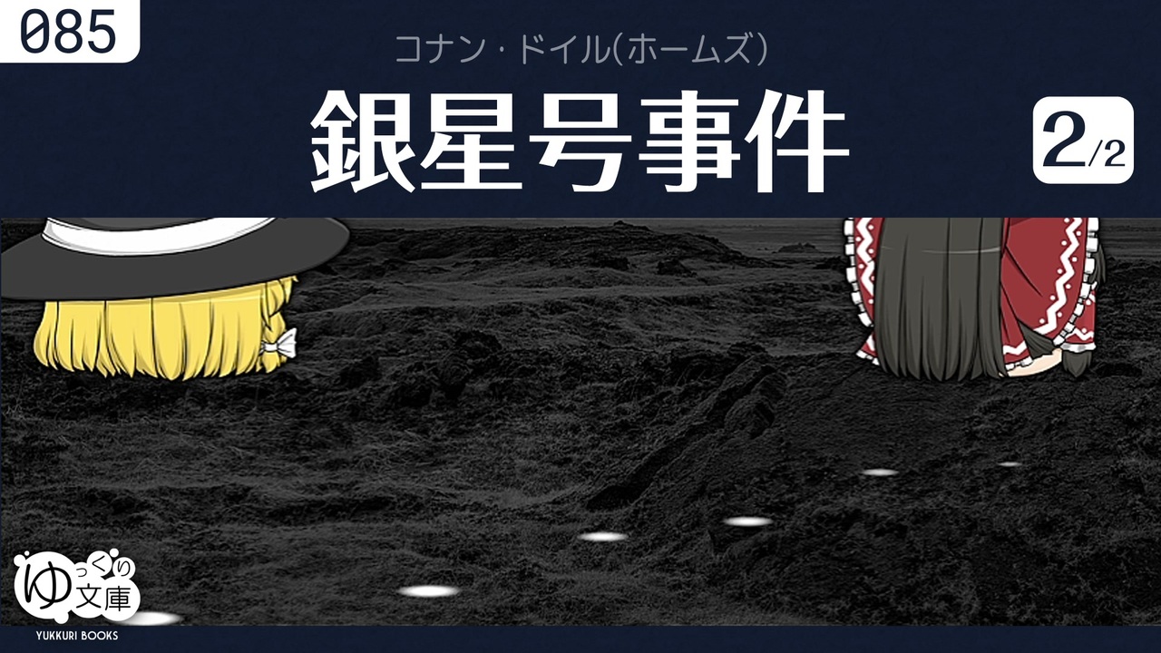 <span style="color: red;"><strong>085b 知覚を拡張する──</strong></span><br>ダートムーアに到着したホームズとワトソン。見落とされた手がかりから名馬の行方を追って、ついに事件当日の全貌をつかむのだが・・・。想像力によって過去を組み立て、未来を創ろう。<br><span style="color: green;">Silver Blaze by Arthur Conan Doyle (1892)</span><br><br><span style="font-size: 18px;"><strong>YouTubeに第2版:<a href="https://youtu.be/RDQzQHxBjqM" target="_blank" rel="noopener nofollow">https://youtu.be/RDQzQHxBjqM</a></strong></span><br><br>編集後記:<a href="http://trynext.com/story/ybook/yb085.php" target="_blank" rel="noopener nofollow">http://trynext.com/story/ybook/yb085.php</a><br><br>●ゆっくりホームズ <a href="https://www.nicovideo.jp/mylist/44188743" target="_blank" rel="noopener">mylist/44188743</a><br><a href="https://www.nicovideo.jp/watch/sm22450907" class="watch">sm22450907</a> 青い紅玉<br><a href="https://www.nicovideo.jp/watch/sm22787351" class="watch">sm22787351</a> ボヘミアの醜聞<br><a href="https://www.nicovideo.jp/watch/sm23572552" class="watch">sm23572552</a> ブルースパーティントン設計書<br><a href="https://www.nicovideo.jp/watch/sm24396455" class="watch">sm24396455</a> 赤毛連盟<br><a href="https://www.nicovideo.jp/watch/sm25669536" class="watch">sm25669536</a> 最後の事件<br><a href="https://www.nicovideo.jp/watch/sm25736285" class="watch">sm25736285</a> 最後の事件 ※ホームズ視点<br><a href="https://www.nicovideo.jp/watch/sm27909988" class="watch">sm27909988</a> 空き家の冒険<br><a href="https://www.nicovideo.jp/watch/sm27922359" class="watch">sm27922359</a> 踊る人形<br><a href="https://www.nicovideo.jp/watch/sm29638118" class="watch">sm29638118</a> 六つのナポレオン<br><a href="https://www.nicovideo.jp/watch/sm31456235" class="watch">sm31456235</a> 緋色の研究 (1/3)<br><a href="https://www.nicovideo.jp/watch/sm31457579" class="watch">sm31457579</a> 緋色の研究 (2/3)<br><a href="https://www.nicovideo.jp/watch/sm31457663" class="watch">sm31457663</a> 緋色の研究 (3/3)<br><a href="https://www.nicovideo.jp/watch/sm33822819" class="watch">sm33822819</a> 犯人は二人<br><a href="https://www.nicovideo.jp/watch/sm35784951" class="watch">sm35784951</a> 銀星号事件 (1/2)<br><a href="https://www.nicovideo.jp/watch/sm35789559" class="watch">sm35789559</a> <span style="color: #ff00ff;"><strong>銀星号事件 (2/2)</strong></span><br><a href="https://www.nicovideo.jp/watch/sm38943588" class="watch">sm38943588</a> 花婿失踪事件<br><a href="https://www.nicovideo.jp/watch/sm40101123" class="watch">sm40101123</a> 修道院屋敷<br><a href="https://www.nicovideo.jp/watch/sm40132626" class="watch">sm40132626</a> ワトソンの推理法修行<br><br>●ゆっくり文庫について<br>全部:<a href="https://www.nicovideo.jp/mylist/74874627" target="_blank" rel="noopener">mylist/74874627</a><br>近況:<a href="https://twitter.com/trynext" target="_blank" rel="noopener nofollow">https://twitter.com/trynext</a><br><br>