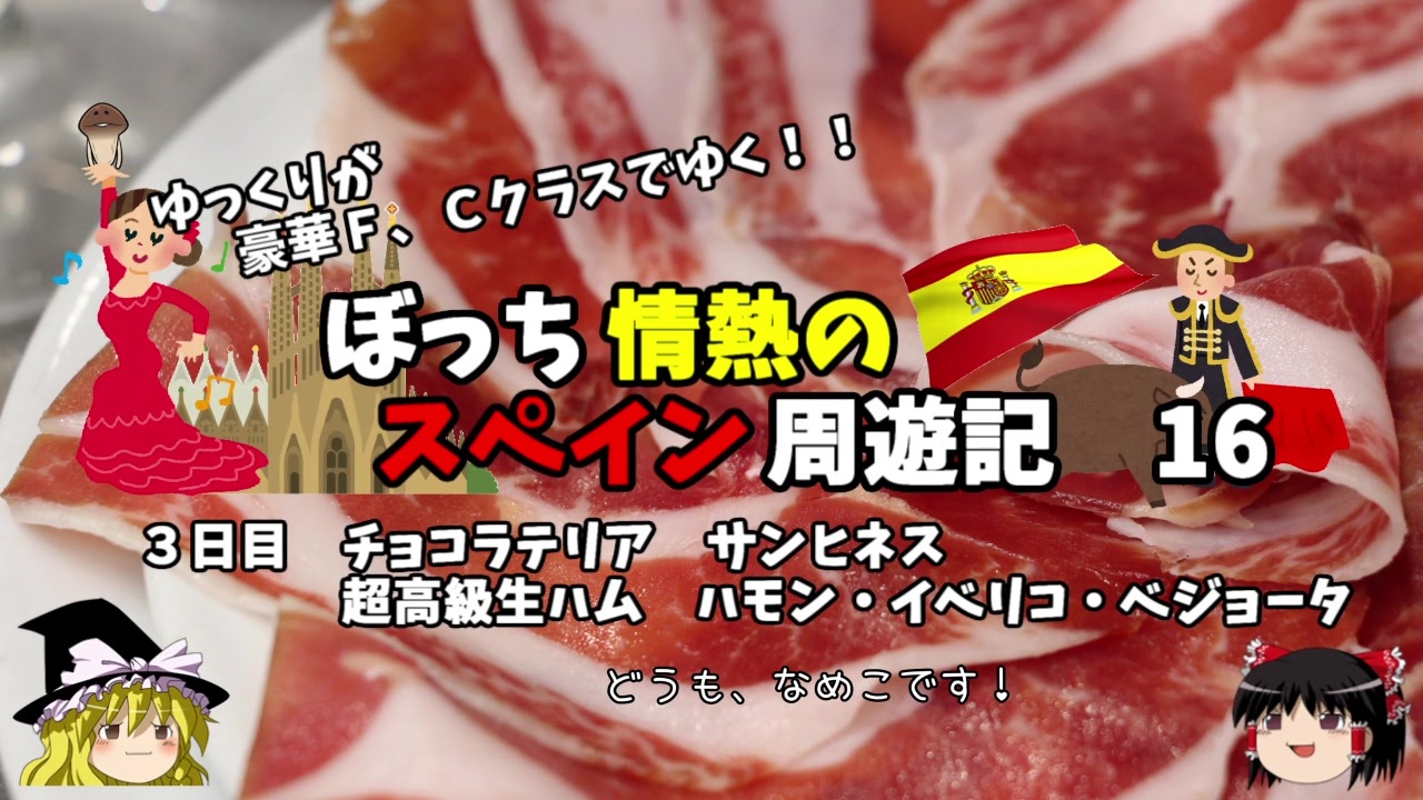 <span style="color: #ff0000; font-size: medium;"><u>※Youtubeで1話分、先行配信中 </u></span><br><span style="color: #0000ff; font-size: medium;"> <a href="http://www.youtube.com/c/なめこのぼっち旅" target="_blank" rel="noopener nofollow">http://www.youtube.com/c/なめこのぼっち旅</a></span> <br><br><br>旅行3日目!<br>まずは朝からグルメ!<br>本場のチュロスと超高級生ハム、ハモン・イベリコ・ベジョータを食べます!<br><br><span style="color: #ff0000;">コミュニティー→co2910020</span><br><br> twitter→<a href="https://twitter.com/ryontan" target="_blank" rel="noopener nofollow">https://twitter.com/ryontan</a><br><br><a href="https://www.nicovideo.jp/watch/sm35772147" class="watch">sm35772147</a>←前回 <span style="color: #ff0000;">次回 第17話→</span><a href="https://www.nicovideo.jp/watch/sm35826652" class="watch">sm35826652</a><br><br>解説・雑談系→<a href="https://www.nicovideo.jp/mylist/63171869" target="_blank" rel="noopener">mylist/63171869</a><br>今作 スペイン周遊記→<a href="https://www.nicovideo.jp/mylist/64537827" target="_blank" rel="noopener">mylist/64537827</a><br>前作 韓国トルコ旅行記→<a href="https://www.nicovideo.jp/mylist/63654428" target="_blank" rel="noopener">mylist/63654428</a><br>車中泊旅行記→<a href="https://www.nicovideo.jp/mylist/54706524" target="_blank" rel="noopener">mylist/54706524</a><br>久米島(沖縄)旅行記→<a href="https://www.nicovideo.jp/mylist/63059251" target="_blank" rel="noopener">mylist/63059251</a><br>イギリスタイ旅行記→<a href="https://www.nicovideo.jp/mylist/60044833" target="_blank" rel="noopener">mylist/60044833</a><br>クルーズ旅行記→<a href="https://www.nicovideo.jp/mylist/57397685" target="_blank" rel="noopener">mylist/57397685</a><br>ドイツ周遊記→<a href="https://www.nicovideo.jp/mylist/54938346" target="_blank" rel="noopener">mylist/54938346</a><br>北海道旅行記→<a href="https://www.nicovideo.jp/mylist/52618057" target="_blank" rel="noopener">mylist/52618057</a><br>アメリカ横断記→<a href="https://www.nicovideo.jp/mylist/48621785" target="_blank" rel="noopener">mylist/48621785</a><br>イタリア周遊記→<a href="https://www.nicovideo.jp/mylist/45763559" target="_blank" rel="noopener">mylist/45763559</a><br>NY旅行記→<a href="https://www.nicovideo.jp/mylist/44343854" target="_blank" rel="noopener">mylist/44343854</a>