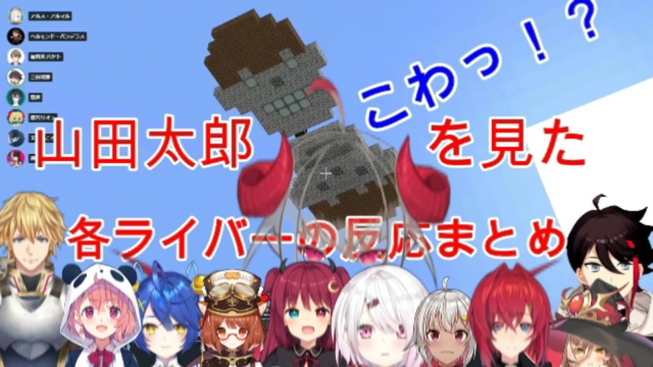 【山田はいつも見ている】<br>マイクラにじさんじ鯖で、魔界ノりりむさんが製作した「山田太郎」が好き過ぎて投稿。<br>他ライバーさんの驚く姿にご注目です。<br><br><span style="color: #000000; font-size: 14px;">にじマイリスト </span><span style="color: #006699; font-size: 14px;"><a href="https://www.nicovideo.jp/mylist/66633056" target="_blank" rel="noopener">mylist/66633056</a></span><br><br>元配信<br>【Minecraft】冒険の始まり!【にじさんじ/#りりむとあそぼう】<a href="https://www.youtube.com/watch?v=PsTWA17vsxs&t=1657s" target="_blank" rel="noopener nofollow">https://www.youtube.com/watch?v=PsTWA17vsxs&t=1657s</a><br>【Minecraft】初心者ソシエと狂人葉山と美少女アンジュの冒険譚【にじさんじ/アンジュ・カトリーナ<a href="https://www.youtube.com/watch?v=XA1ItGg1Cps&t=2s" target="_blank" rel="noopener nofollow">https://www.youtube.com/watch?v=XA1ItGg1Cps&t=2s</a><br>【マイクラ】納得がいかねぇ!!家が勝手に攻撃しただけなのに!!【にじさんじ】<a href="https://www.youtube.com/watch?v=jcymbKONZaI&t=581s" target="_blank" rel="noopener nofollow">https://www.youtube.com/watch?v=jcymbKONZaI&t=581s</a><br>【Minecraft】加賀美インダストリアルにインターン入社【三枝明那 / にじさんじ】<a href="https://www.youtube.com/watch?v=k980kTDlC-Y" target="_blank" rel="noopener nofollow">https://www.youtube.com/watch?v=k980kTDlC-Y</a><br>【マイクラ】家をもう一度立てて全部爆破したい!!クリーパーで!!【にじさんじ】<a href="https://www.youtube.com/watch?v=XBF4y_uLmAk&t=4s" target="_blank" rel="noopener nofollow">https://www.youtube.com/watch?v=XBF4y_uLmAk&t=4s</a><br>#02【 Minecraft 】まずは拠点を探す!【ラトナ・プティ/にじさんじ】<a href="https://www.youtube.com/watch?v=ole90Sw3YiE&t=3733s" target="_blank" rel="noopener nofollow">https://www.youtube.com/watch?v=ole90Sw3YiE&t=3733s</a><br>【マインクラフト】にじさんじランドorマイハウス ふぁい!【天宮こころ/にじさんじ】<a href="https://www.youtube.com/watch?v=eaBWCATpcIU&t=1849s" target="_blank" rel="noopener nofollow">https://www.youtube.com/watch?v=eaBWCATpcIU&t=1849s</a><br>【マイクラ】お墓のまわりきれいにするのだ【作業】<a href="https://www.youtube.com/watch?v=wH64sCePBeY&t=15467s" target="_blank" rel="noopener nofollow">https://www.youtube.com/watch?v=wH64sCePBeY&t=15467s</a><br>【minecraft】にじさんじランド遊びつくすんじゃー!!#siirii【にじさんじ/椎名唯華】<a href="https://www.youtube.com/watch?v=rQDTxHxE-1g&t=4s" target="_blank" rel="noopener nofollow">https://www.youtube.com/watch?v=rQDTxHxE-1g&t=4s</a><br>【minecraft】ロクサスといっしょに住む。親友だもの。【笹木咲/にじさんじ】<a href="https://www.youtube.com/watch?v=BpkCBHl87kI&t=3359s" target="_blank" rel="noopener nofollow">https://www.youtube.com/watch?v=BpkCBHl87kI&t=3359s</a>