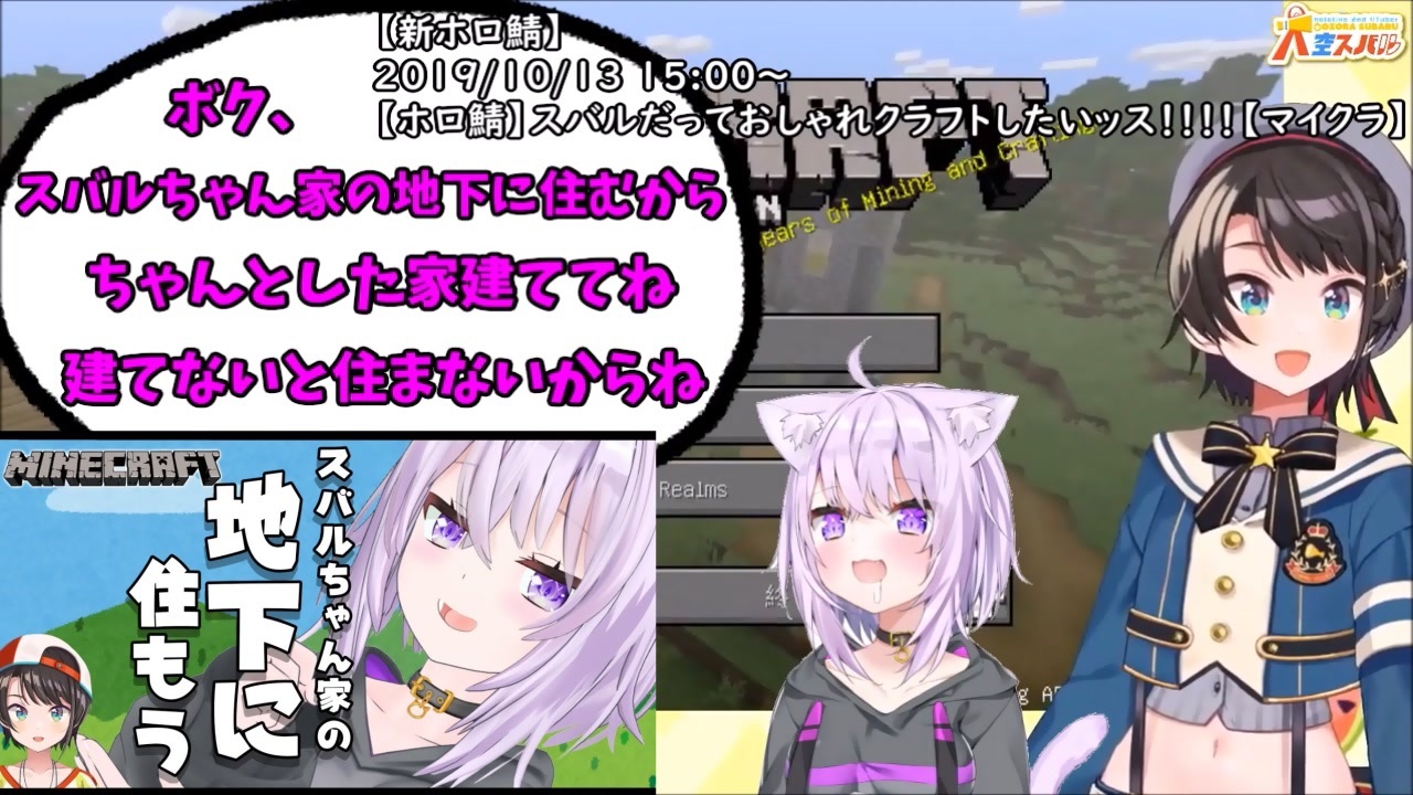 <span style="font-size: 16px;"><strong>【旧ホロ鯖時代】</strong></span><br>元動画①:<strong>【ホロ鯖】スバル、エンチャントしたいッス!!!【マイクラ】</strong><br><a href="https://www.youtube.com/watch?v=GH58Uf6ezkE" target="_blank" rel="noopener nofollow">https://www.youtube.com/watch?v=GH58Uf6ezkE</a><br><br><span style="font-size: 16px;"><strong>【新ホロ鯖時代】</strong></span><br>元動画②:<strong>【ホロ鯖】スバルだっておしゃれクラフトしたいッス!!!!【マイクラ】</strong><br><a href="https://www.youtube.com/watch?v=CVs5Y8R-bQs" target="_blank" rel="noopener nofollow">https://www.youtube.com/watch?v=CVs5Y8R-bQs</a><br>元動画③:<strong>【ホロ鯖】新サーバーで家作ります【ホロライブ/猫又おかゆ】</strong><br><a href="https://www.youtube.com/watch?v=VzI6KiUzZR4" target="_blank" rel="noopener nofollow">https://www.youtube.com/watch?v=VzI6KiUzZR4</a><br><br><br><span style="font-size: 16px;"><strong>大空スバル(ホロライブ)</strong></span><br><strong>チャンネル</strong>:<a href="https://www.youtube.com/channel/UCvzGlP9oQwU--Y0r9id_jnA" target="_blank" rel="noopener nofollow">https://www.youtube.com/channel/UCvzGlP9oQwU--Y0r9id_jnA</a><br><strong>Twitter</strong>:<a href="https://twitter.com/oozorasubaru" target="_blank" rel="noopener nofollow">https://twitter.com/oozorasubaru</a><br><br><span style="font-size: 16px;"><strong>猫又おかゆ(ホロライブゲーマーズ)</strong></span><br><strong>チャンネル</strong>:<a href="https://www.youtube.com/channel/UCvaTdHTWBGv3MKj3KVqJVCw" target="_blank" rel="noopener nofollow">https://www.youtube.com/channel/UCvaTdHTWBGv3MKj3KVqJVCw</a><br><strong>Twitter</strong>:<a href="https://twitter.com/nekomataokayu" target="_blank" rel="noopener nofollow">https://twitter.com/nekomataokayu</a><br><br><br>Twitter:<a href="https://twitter.com/reecevvv" target="_blank" rel="noopener nofollow">https://twitter.com/reecevvv</a>