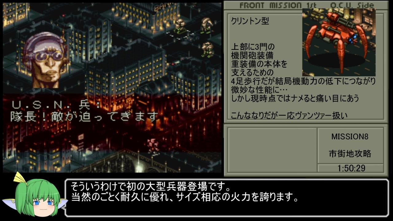 見所のない回をどうするか、それが問題だ<br><br>MISSION8~9終了まで<br><br>計測開始:タイトル画面でスタートボタン押下時<br>計測終了:エンディング終了後、「THE END」の文字が表示された瞬間<br><br>使用機種:PSアーカイブス版<br>使用ハード:PSVITATV<br><br>参考文献:SFC版ミリタリーガイド<br>データ引用元:<a href="https://tenmou.net" target="_blank" rel="noopener nofollow">https://tenmou.net</a><br>マップ借用元:<a href="https://w.atwiki.jp/frontmission1st/pages/1.html" target="_blank" rel="noopener nofollow">https://w.atwiki.jp/frontmission1st/pages/1.html</a><br><br><br>Part1→<a href="https://www.nicovideo.jp/watch/sm35762513" class="watch">sm35762513</a><br>前(Part4)→<a href="https://www.nicovideo.jp/watch/sm35815645" class="watch">sm35815645</a> <span style="font-size: 18px;">次→<a href="https://www.nicovideo.jp/watch/sm35880375" class="watch">sm35880375</a></span><br><br>マイリスト<br><a href="https://www.nicovideo.jp/mylist/66628757" target="_blank" rel="noopener">mylist/66628757</a><br><br>投稿動画Part1集<br><a href="https://www.nicovideo.jp/mylist/58180228" target="_blank" rel="noopener">mylist/58180228</a><br><br>総勢150名(義)の兄貴達、宣伝アリシャス!<br>