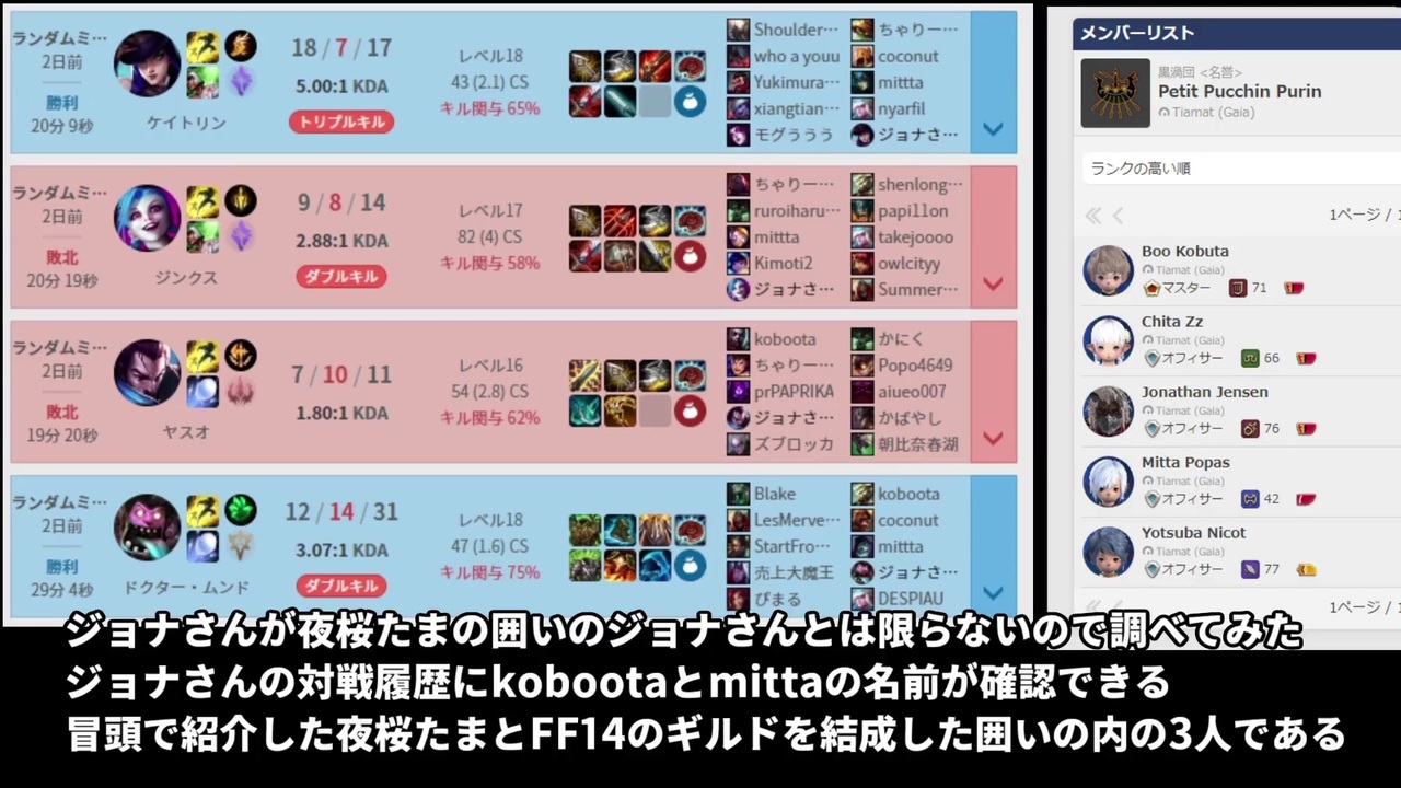 <span style="color: #262626; font-size: 16px;"><strong><u>夜桜たまの軌跡</u></strong></span><br>9月下旬 男VtuberてんまとLoLを遊ぶ<br>10/01 前世の囲い4人とFF14ギルドを結成する<br>10/06深夜 公式ツイッターの自己紹介、ヘッダーを突如削除しファンを騒がせる<br>10/07深夜 公式ツイッターでお気持ちツイートを投稿しファンを騒がせる<br>10/07朝 男VtuberてんまとLoLを遊ぶ<br>10/07夜 号泣お気持ち配信をする。「ライブ告知が後回しになっていたと言われ悲しかった」<br>(10/08 花京院ちえりの配信でチャットがひどく荒らされる。低評価1400)<br>10/17 前世の囲いmittaとLoLで遊ぶ<br>(10/18 花京院ちえりの配信でチャットがひどく荒らされる。低評価1200)<br>10/19 男VtuberてんまとLoLで遊ぶ<br>10/23 前世の囲いジョナさんとLoLで遊ぶ<br><br>同僚の配信が荒らされようが、ファンが毎日心配しようが、<br><span style="font-size: 13px;">それらすべてを無視して囲いと遊ぶあなたの姿は、<br>アイドル部で活動していた頃に比べてよりいっそう輝いて見えますね。</span>