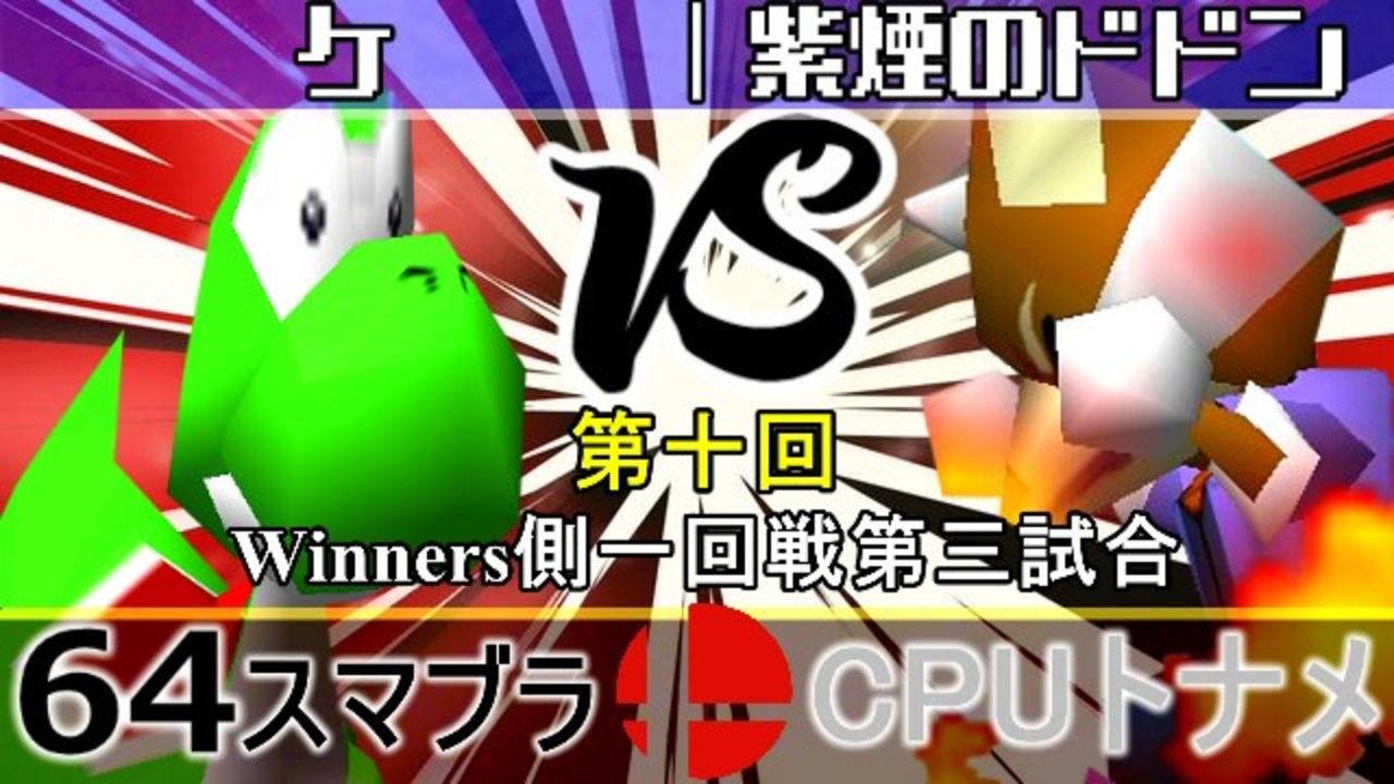 謎 vs ドドニスト<br>※どちらが勝つかアンケ結果(Twitter調べ) <br>ケ(YO) 73% VS 紫煙のドドン(FO) 27%<br><br><span style="color: #0000ff; font-size: 13px;"><u>※64スマブラCPUトナメ実況wiki</u></span><span style="color: #0000ff; font-size: 13px;">→</span> <a href="https://wiki3.jp/64cpu_P" target="_blank" rel="noopener nofollow">https://wiki3.jp/64cpu_P</a><br><br><span style="color: #ff0000; font-size: 24px;"><strong>次→</strong></span>【<a href="https://www.nicovideo.jp/watch/sm35884248" class="watch">sm35884248</a>】※毎日投稿<br><br>前【<a href="https://www.nicovideo.jp/watch/sm35875683" class="watch">sm35875683</a>】 Winners一回戦第一試合【<a href="https://www.nicovideo.jp/watch/sm35872182" class="watch">sm35872182</a>】 <span style="color: #000000; font-size: 13px;">予選</span>Aブロック第一試合【<a href="https://www.nicovideo.jp/watch/sm35254266" class="watch">sm35254266</a>】 <br><span style="font-size: 14px;">第十回選手紹介動画【</span><span style="color: #006699; font-size: 14px;"><a href="https://www.nicovideo.jp/watch/sm35240933" class="watch">sm35240933</a></span><span style="font-size: 14px;">】</span><br>第十回マイリスト【<a href="https://www.nicovideo.jp/mylist/65788927" target="_blank" rel="noopener">mylist/65788927</a>】<br>64スマブラCPUトナメ実況part1まとめ【<a href="https://www.nicovideo.jp/mylist/60846861" target="_blank" rel="noopener">mylist/60846861</a>】<br>その他シリーズ【<a href="https://www.nicovideo.jp/mylist/12965027" target="_blank" rel="noopener">mylist/12965027</a>】<br><br><span style="color: #00bfff; font-size: 13px;"><strong>Twitter</strong></span>【<a href="https://twitter.com/niconicopppppp" target="_blank" rel="noopener nofollow">https://twitter.com/niconicopppppp</a> 】<br><span style="color: #ff4500; font-size: 13px;"><strong>チャンネル</strong></span>【<a href="https://ch.nicovideo.jp/p-desu" target="_blank" rel="noopener">ch.nicovideo.jp/p-desu</a>】