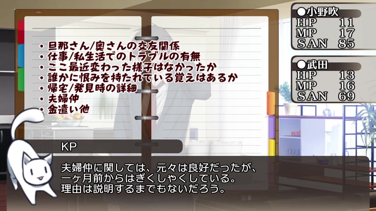 本作は、「 株式会社アークライト 」及び「株式会社KADOKAWA」が権利を有する『クトゥルフ神話TRPG』の二次創作物です。<br><br>Call of Cthulhu is copyright ©1981, 2015, 2019 by Chaosium Inc. ;all rights reserved. Arranged by Arclight Inc.<br>Call of Cthulhu is a registered trademark of Chaosium Inc.<br>PUBLISHED BY KADOKAWA CORPORATION 「クトゥルフ神話TRPG」<br><br>※当シナリオはシナリオ集「月下神話絵巻」に収録されています。<br><a href="https://colorcat.booth.pm/items/1662558" target="_blank" rel="noopener nofollow">https://colorcat.booth.pm/items/1662558</a><br><br>はっぴーはろうぃーん。(華菜ちゃんボイスで脳内再生される)<br><br>今回次回と、行き先変更したり等で結構ぐだぐだしています。<br>いつものことだった。<br><br>今回は特殊セッションです。<br>特定探索者の過去に遡ってお送りしています。<br>通常のリプレイとはかなり異なりますので、第一章第一話(<a href="https://www.nicovideo.jp/watch/sm33961665" class="watch">sm33961665</a>)の注意書きをよくお読みください。<br>また、身内卓につきハウスルールましましで色々緩いですが、ご容赦ください。<br><br>今回は他シリーズにて登場した探索者(小野吹&武田)の過去の物語第三弾です。<br>先に関連作品を見ていただいた方が、楽しんでいただけると思います。<br>会話やコメント等で関連作品のネタバレが出てくる可能性もありますので、先に他シリーズの動画を見ていただくことを推奨します。<br><br>※「白い夢の果て」のネタバレが特に多く含まれます。<br>ご注意ください。<br><br>広告して下さる皆さん、いつもありがとうございます。<br>まとめてのお礼となりまして恐縮ですが、今後とも頑張ります。<br><br>[クトゥルフ動画一覧]<a href="https://www.nicovideo.jp/mylist/60110794" target="_blank" rel="noopener">mylist/60110794</a><br>[part1動画一覧]<a href="https://www.nicovideo.jp/mylist/60289921" target="_blank" rel="noopener">mylist/60289921</a><br>[今作mylist]<a href="https://www.nicovideo.jp/mylist/63522801" target="_blank" rel="noopener">mylist/63522801</a><br><br>[前]<a href="https://www.nicovideo.jp/watch/sm35879480" class="watch">sm35879480</a><br>[次]<a href="https://www.nicovideo.jp/watch/sm35961783" class="watch">sm35961783</a><br /><br>色猫卓ポータルサイト<br>→<a href="https://marchocias.xsrv.jp/colorcat/index.html" target="_blank" rel="noopener nofollow">https://marchocias.xsrv.jp/colorcat/index.html</a><br>動画で紹介しても良い支援絵は #いろねこあーと で!<br><br>ピッコマで小説連載開始しました!<br>魔族生まれの聖女様!? 著:黒猫ている<br><a href="https://piccoma.com/web/product/156938" target="_blank" rel="noopener nofollow">https://piccoma.com/web/product/156938</a>
