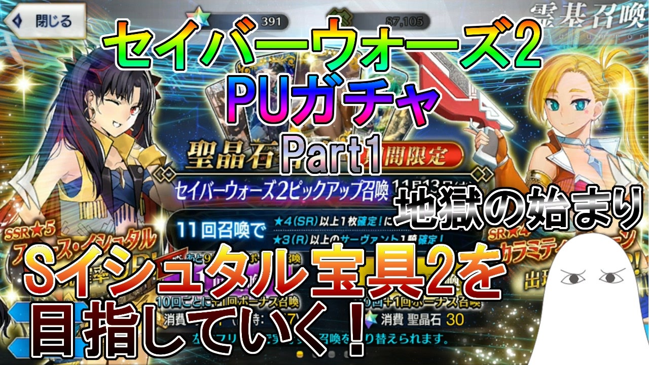 セイバーウォーズ2のPUガチャの動画となります。<br>今回はPart1です。<br><br>動画についてリクエスト等ありましたらコメントやTwitter等にご連絡頂ければ可能な限り検討致します。<br>御用の際には下記アドレスまで宜しくお願いします。<br>連絡先メールアドレス → cecimesfr@gmail.com<br>Twitter → <a href="https://twitter.com/Ceci_startnow" target="_blank" rel="noopener nofollow">https://twitter.com/Ceci_startnow</a><br>今回の動画の音楽は「魔王魂様」「H/MIX GALLERY 様」「甘茶の音楽工房様」からお借りしています<br><br><span style="color: #111111;">前回の動画→</span><a href="https://www.nicovideo.jp/watch/sm35886945" class="watch">sm35886945</a><span style="color: #111111;"> 次回の動画→</span><a href="https://www.nicovideo.jp/watch/sm35889453" class="watch">sm35889453</a><br><u><a href="https://www.nicovideo.jp/mylist/60420393" target="_blank" rel="noopener">mylist/60420393</a></u>