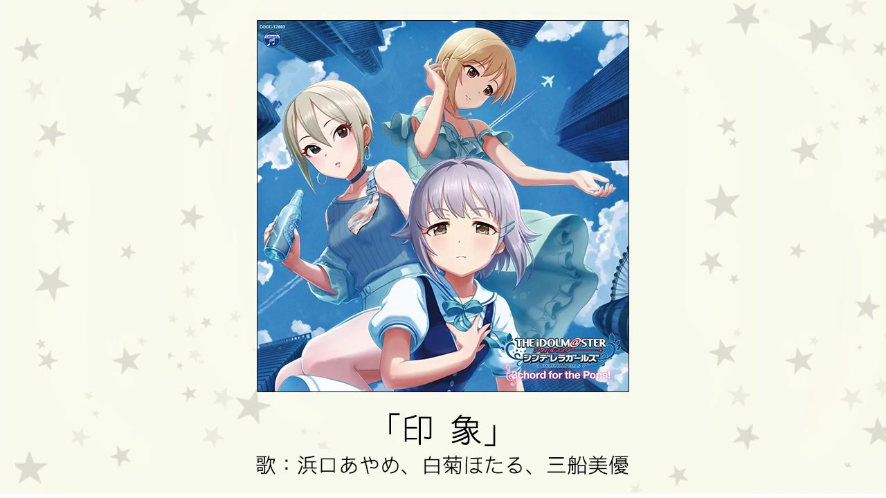 動画元:<a href="https://www.youtube.com/watch?v=KlzjzTUVdIk" target="_blank" rel="noopener nofollow">https://www.youtube.com/watch?v=KlzjzTUVdIk</a><br><br>2019年11月13日発売予定 THE IDOLM@STER CINDERELLA MASTER 3chord for the Pops! COCC-17693[CD1枚組] ¥1,400+税 <br><br>収録内容<br><br>Tr.01 不埒なCANVAS 作詞:只野菜摘 作曲・編曲:烏屋茶房 歌:輿水幸子、塩見周子、相葉夕美 <br><br>Tr.02 印象 作詞:烏屋茶房 作曲・編曲:篠崎あやと 歌:浜口あやめ、白菊ほたる、三船美優 <br><br>Tr.03 不埒なCANVAS オリジナル・カラオケ<br><br>Tr.04 印象 オリジナル・カラオケ ボーナストラック <br><br>Tr.05 comic cosmic(M@STER VERSION) 作詞:只野菜摘 作曲・編曲:篠崎あやと、橘亮祐 歌:佐久間まゆ、久川颯、中野有香、佐々木千枝、堀裕子 <br><br>Tr.06 comic cosmic(M@STER VERSION) オリジナル・カラオケ <br><br>Tr.07 comic cosmic(GAME VERSION) 歌:佐久間まゆ、久川颯、中野有香、佐々木千枝、堀裕子 <br><br>Starring by 歌:輿水幸子(CV:竹達彩奈)、塩見周子(CV:ルゥティン)、相葉夕美(CV:木村珠莉)、浜口あやめ(CV:田澤茉純)、白菊ほたる(CV:天野聡美)、三船美優(CV:原田彩楓)、佐久間まゆ(CV:牧野由依)、久川颯(CV:長江里加)、中野有香(CV:下地紫野)、佐々木千枝(CV:今井麻夏)、堀裕子(CV:鈴木絵理)